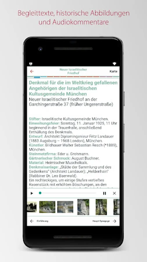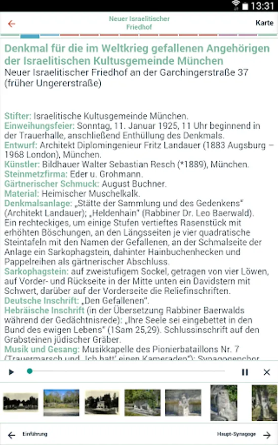 The twelve locations can be accessed via an interactive map. Accompanying texts, historical figures, current photos and audio commentary provides extensive background information. An introduction and a summary comment facilitate historical period. A complete proof directory allows the further deepening.