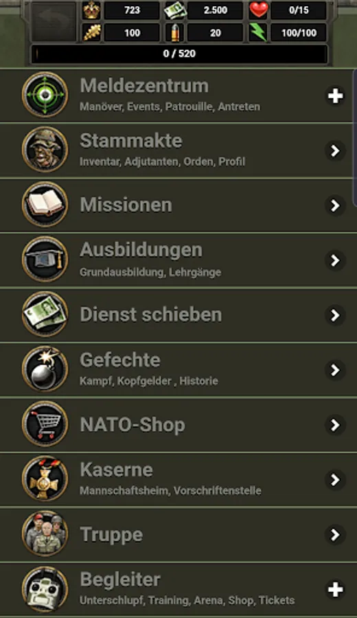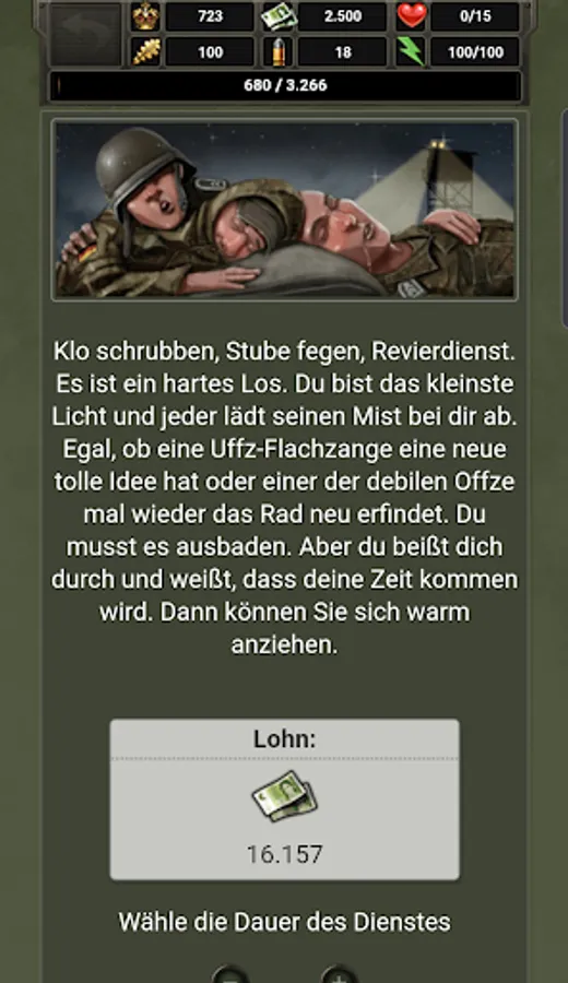 You can choose between Army, Navy and Air Force. You arrange a character according to your wishes and ideas, determine location and type of troops. Arrived in the barracks begins your everyday life at the federal government. You start at the bottom of the leaderboard. Better do not have high hopes for a lightning run! Good things will take a while.