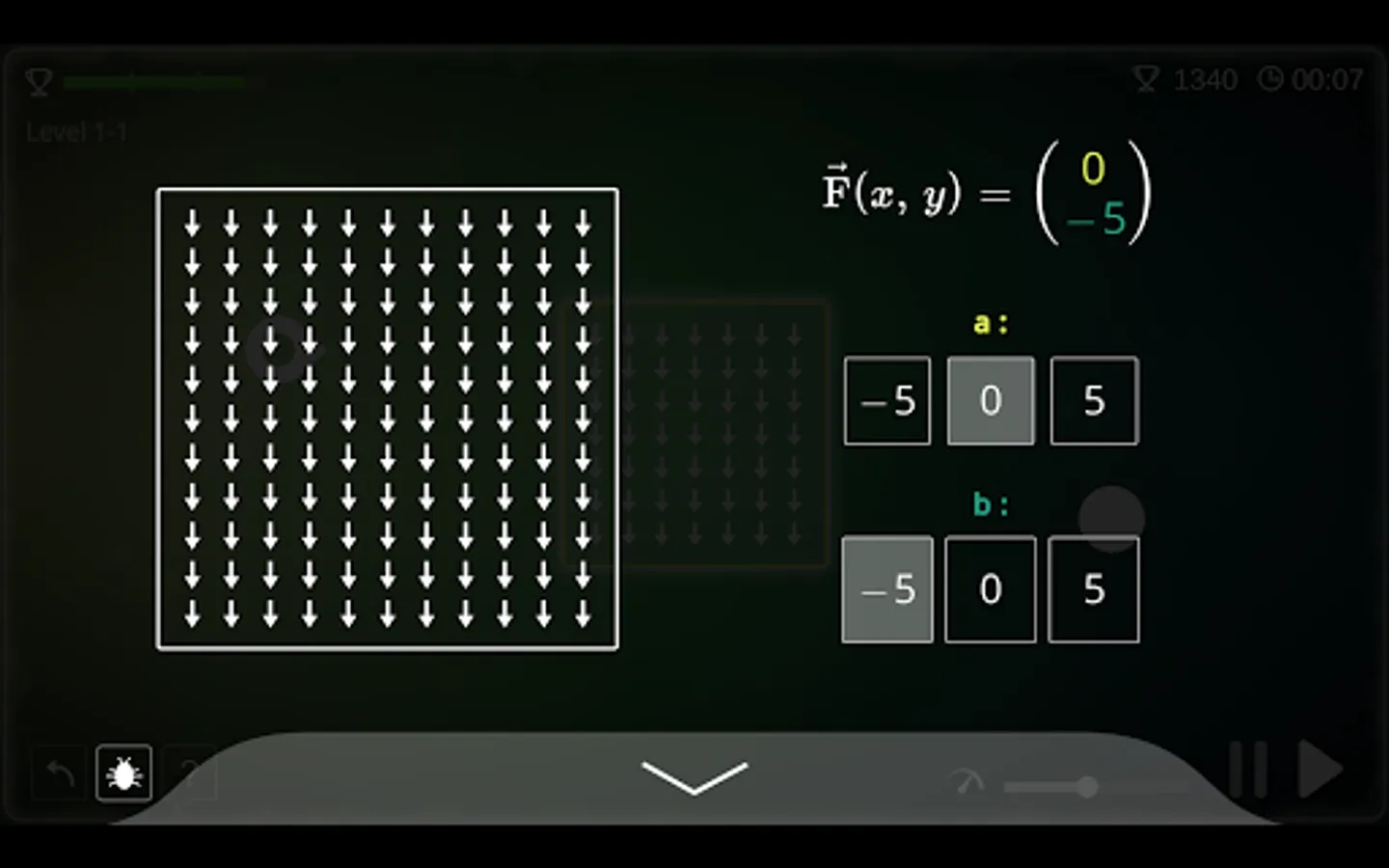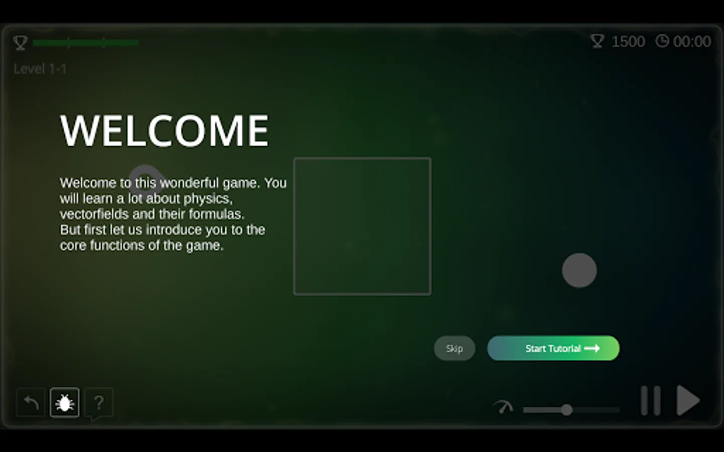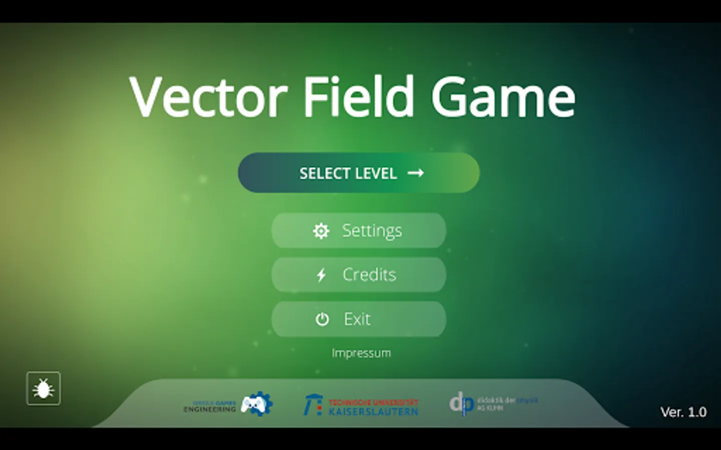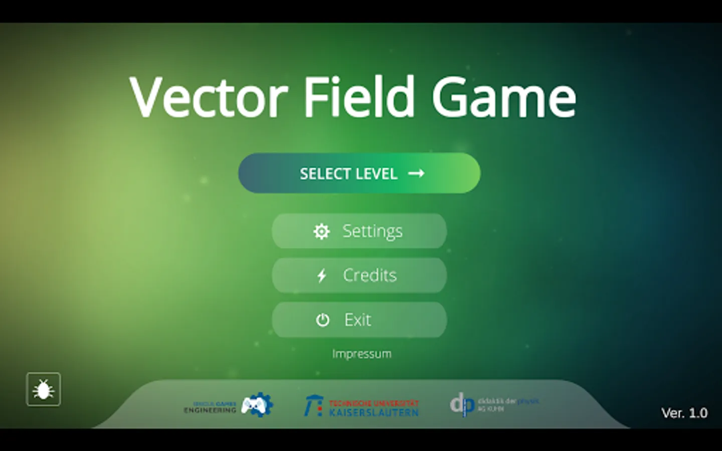 The vector field game allows players to enter the world of vector field mathematics in an entertaining way. The game is in the genre of puzzle and puzzle games. The goal of the game is to direct particles from the starting point to the target point. The vector fields, which can be manipulated by the player using the mathematical formula, can influence the direction and speed of the particles. Graphically, the level is laid out in a minimalist interface design in 2D. The individual levels differ in the coloring and the difficulty. The difficulty is increased in the higher levels by obstacles, charges of the particles and hidden vector fields.