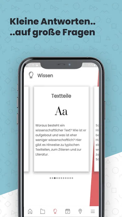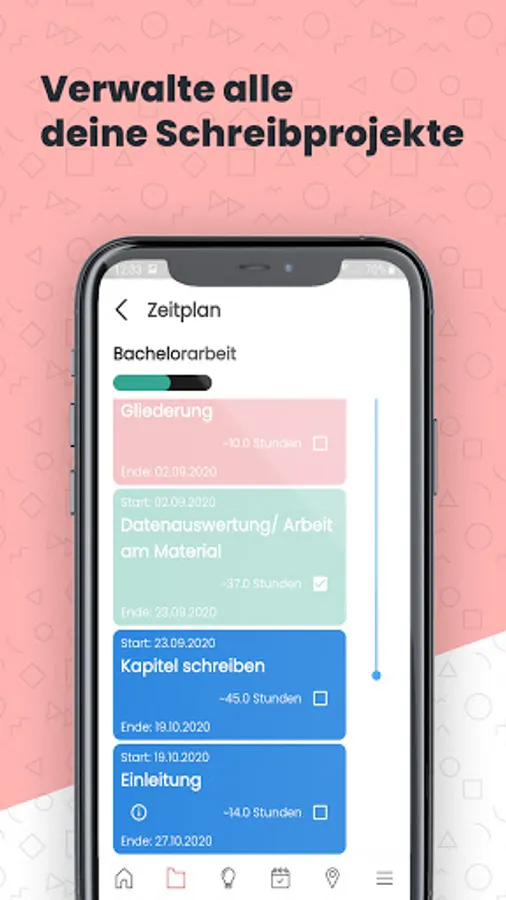 With the study app you can create your term papers, essays or exposés, the bachelor, master or state examination thesis as a writing project. Enter the submission date and the app will keep an eye on important work steps and processing times for you. In addition, you will receive compactly prepared knowledge on all important work steps