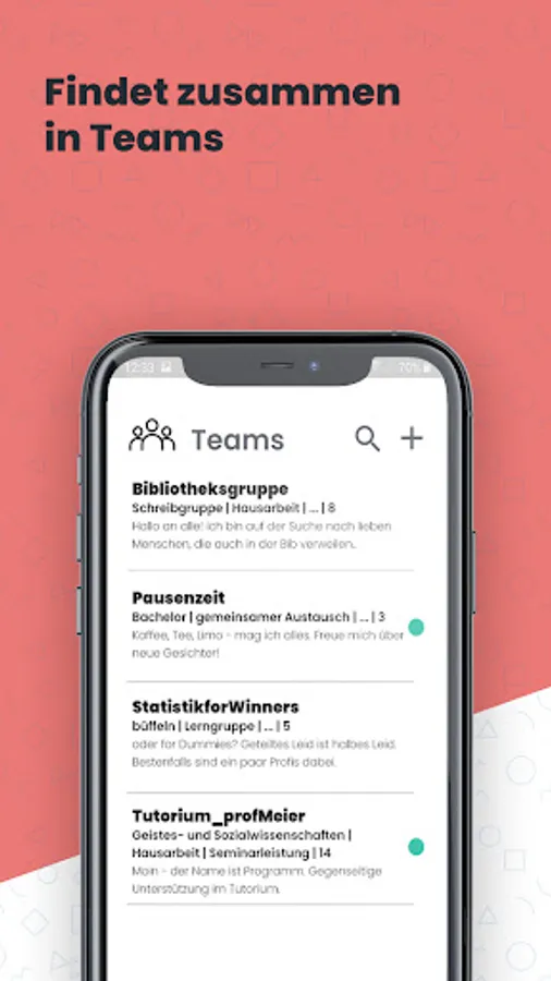 With the study app, you can set up your own teams or join existing ones: Who is currently writing and looking for an exchange? Who takes part in a study group? Who will come to the library? Get to know other students, find groups for your studies and beyond.