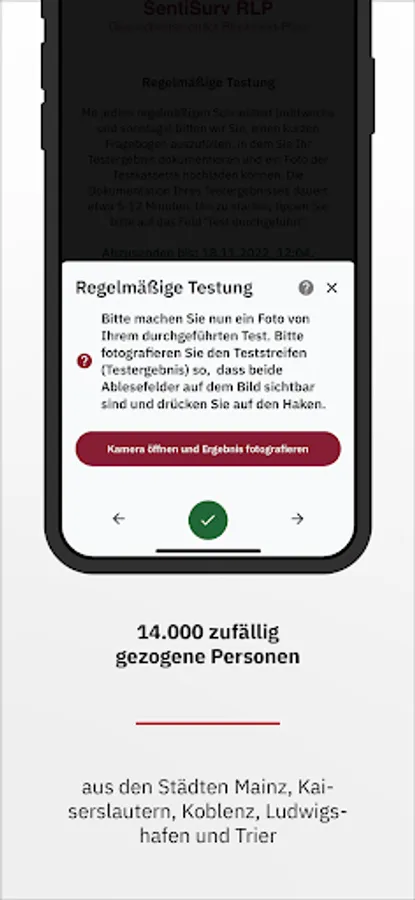 The "SentiSurv RLP App" is used for regular surveys of around 14,000 randomly drawn people from the cities of Mainz, Kaiserslautern, Koblenz, Ludwigshafen and Trier. To log in, you need a personal QR code/number that you received from the SentiSurv team via email. The app can only be used by people who are registered as participants in the study.