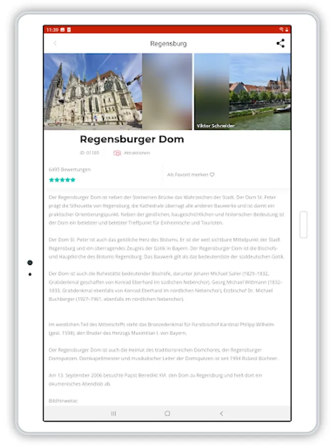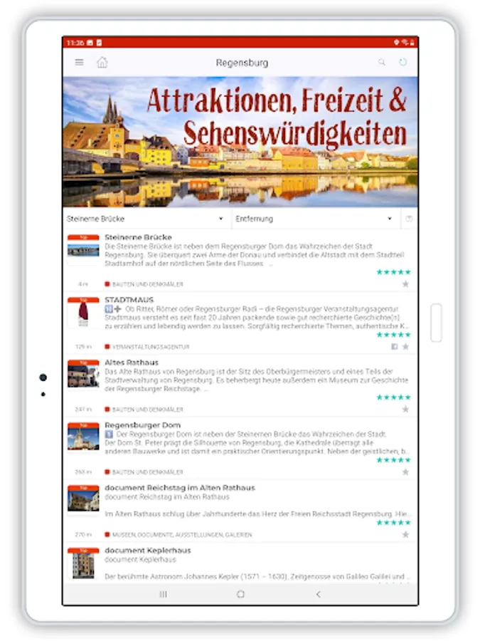 - Attractions, sights and leisure tips for all ages: Regensburg Cathedral, Stone Bridge, House of Bavarian History, Kepler Memorial House, Art Forum East German Gallery, Danube Arena, Jahn Stadium as well as: Theaters, museums, churches, exhibitions, historic buildings, castles and palaces - to name just a few examples. There are also numerous videos of prominent locations and POIs.