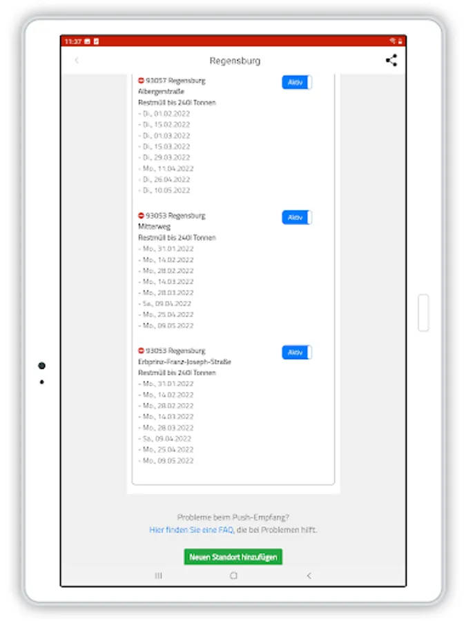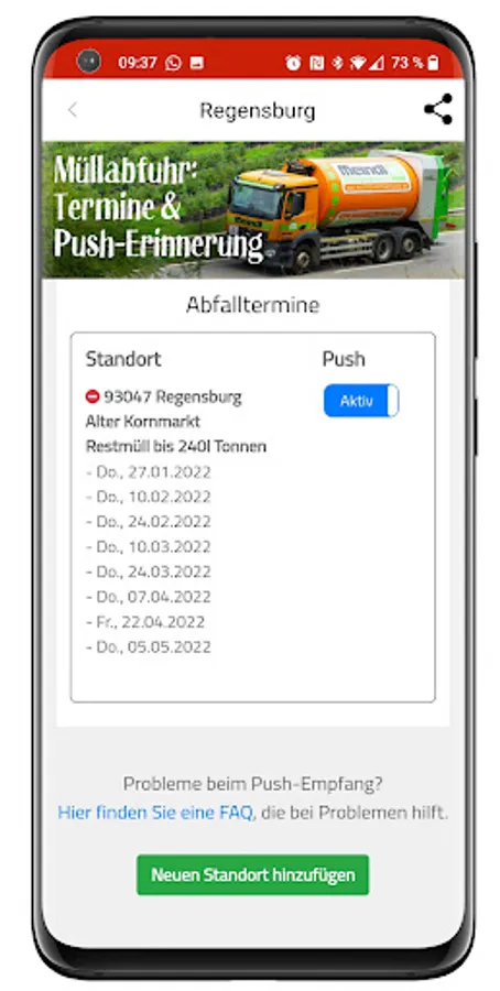 - Garbage collection reminder Regensburg: Get a push notification to remind you to put out the garbage on time. You will receive a push notification one day before the disposal date. A free service for the entire urban area and all types of waste.