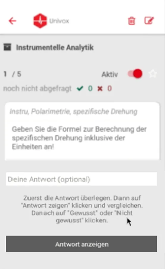 During your semester and especially before the exam, you can go through questions in the index card system that are appropriate for your university and the respective subject. The questions are checked and revised in detail by our Univox team before they are made available to you for learning in the Univox semester trainer.
