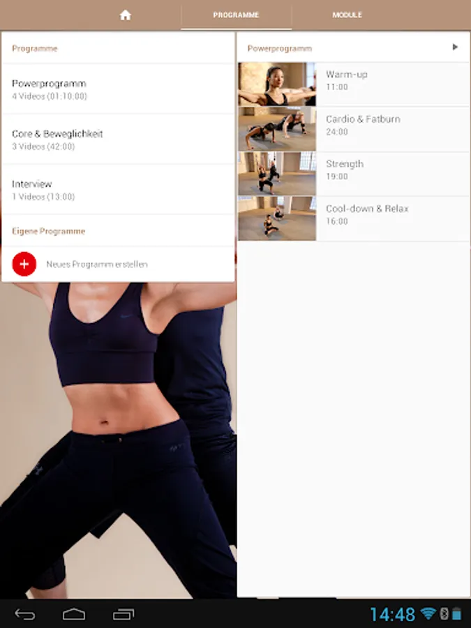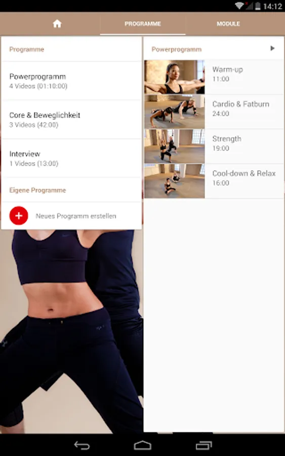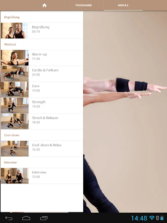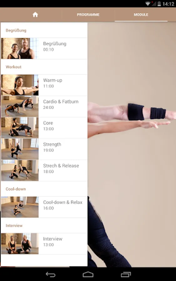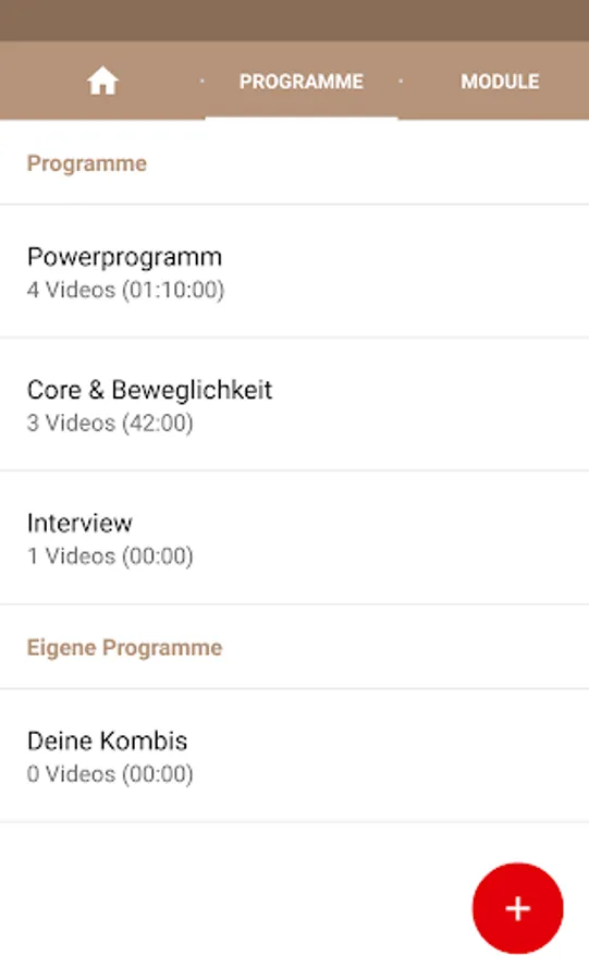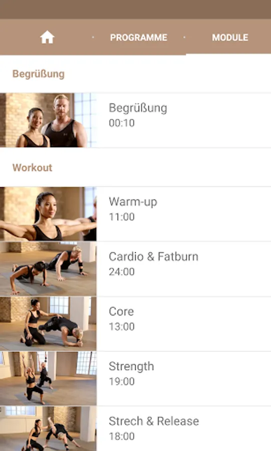 The two main units "power program" and "Core & mobility" are between 45 and 70 minutes. The respective individual modules - each between 10 and 25 minutes - show are provided on request playback separately and combined: