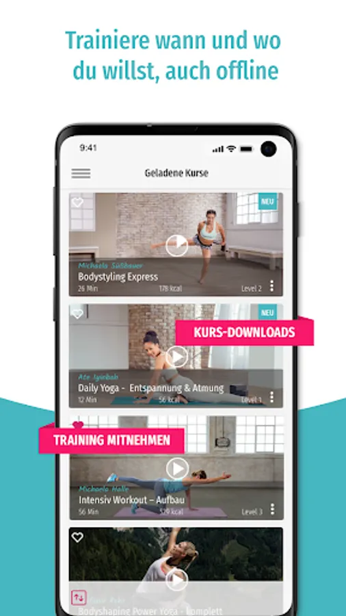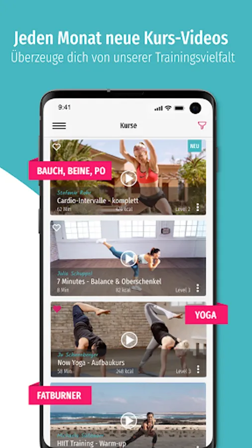 You know what you want to train? Then choose your favorite training based on length, level and mood from over 1000 courses. Whether BBP, Yoga, Pilates, Fatburner or Dance - with our variety of courses you are guaranteed not to get bored! Best of all, you don't have to do without your training when you're on the road or on vacation. Download up to 20 of your favorite courses and train when and where you want - even offline.