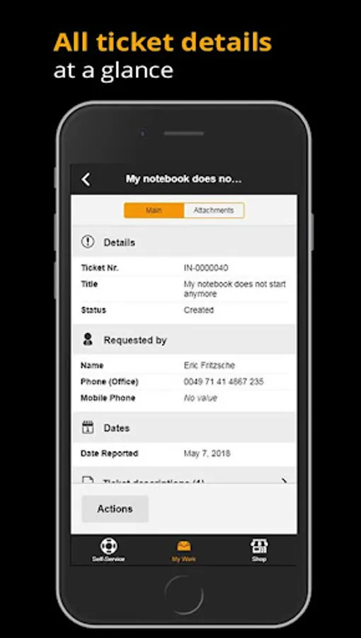 • “My Services” shows the end user which services he currently uses. In the details you can call up further information about the service and display the current tickets for the service.