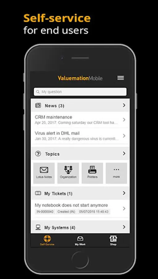 USU's Valuemation software is a product suite for IT service management and enterprise service management. Valuemation Mobile is an extension of USU's Valuemation software for mobile devices. The app supports end users in self-service as well as support staff and service technicians in the mobile processing of incidents/tickets and service requests.