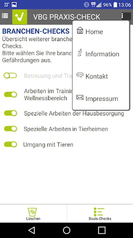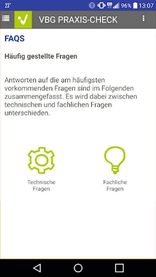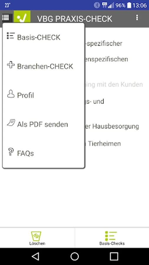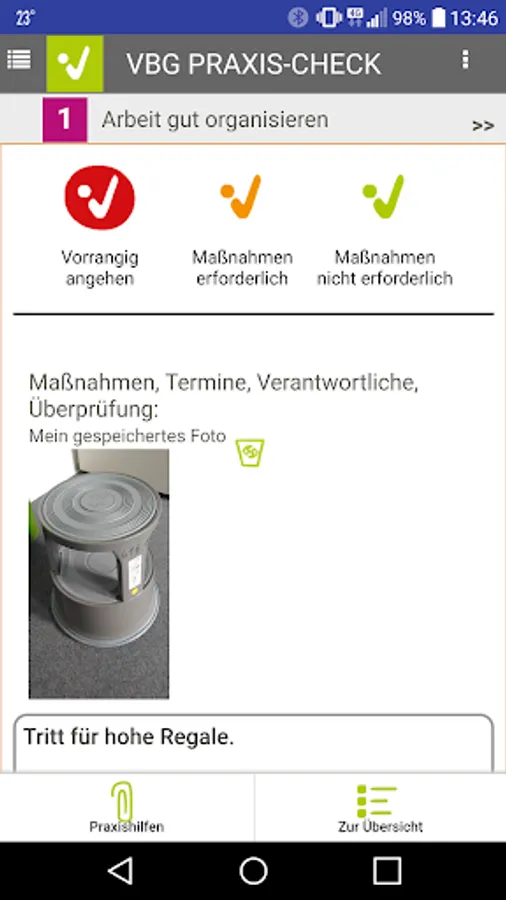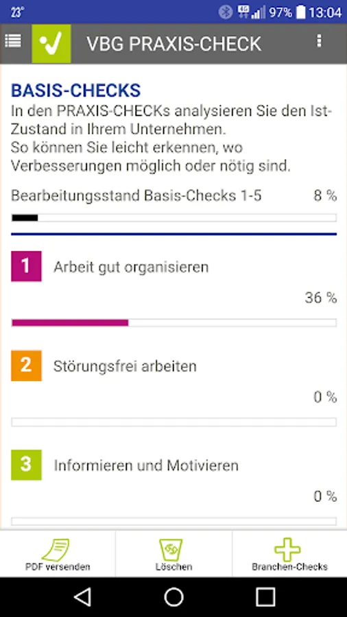 Use the VBG PRAXIS-CHECK app to create the risk assessment for your company in just a few easy steps. Take a little time regularly to determine and assess the hazards and stresses associated with the work for your employees and to take the necessary protective measures. Carry out actions based on the to-do list and check their effectiveness.