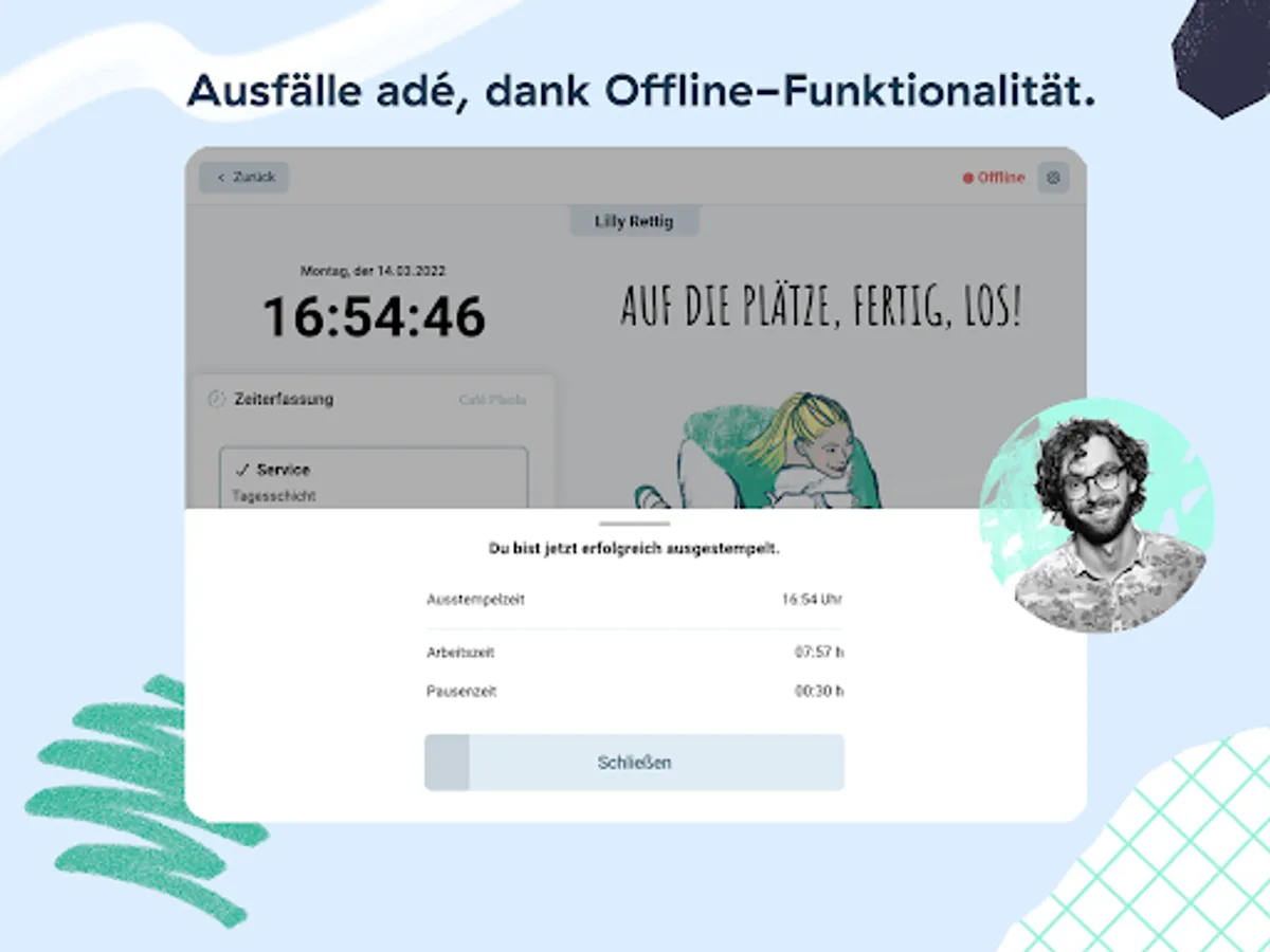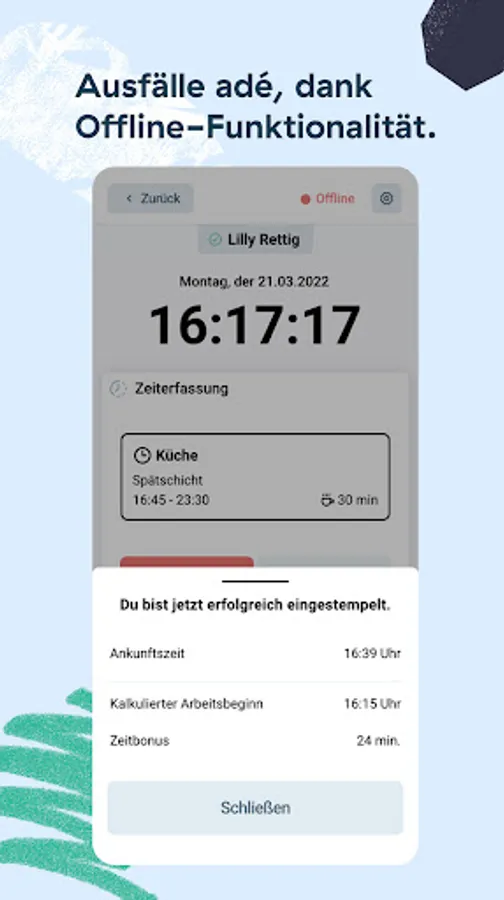 - Time tracking (clock in and out, clock a break, apply for overtime, leave a message) 👉🏼 and all of that offline too