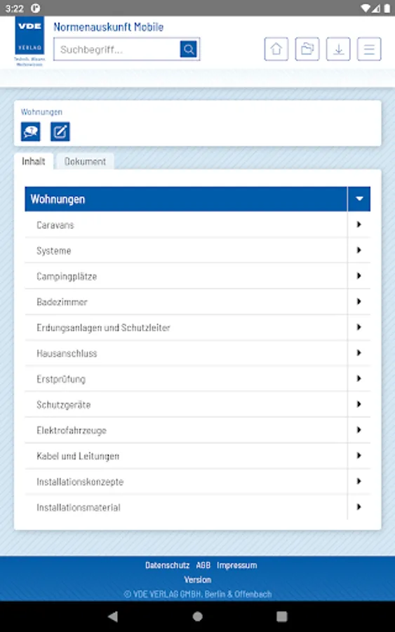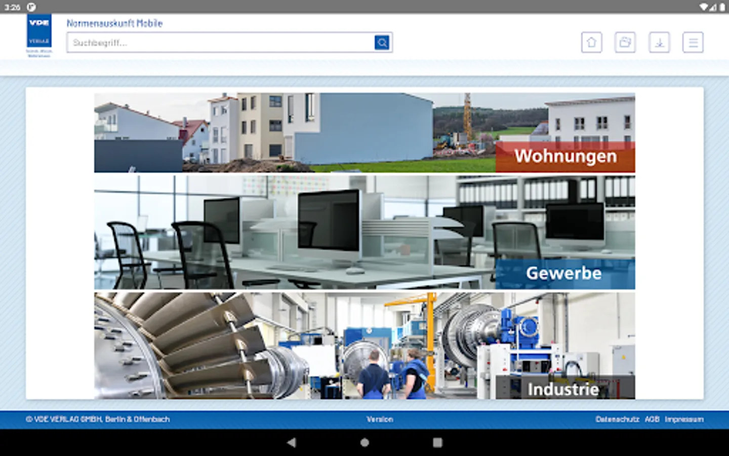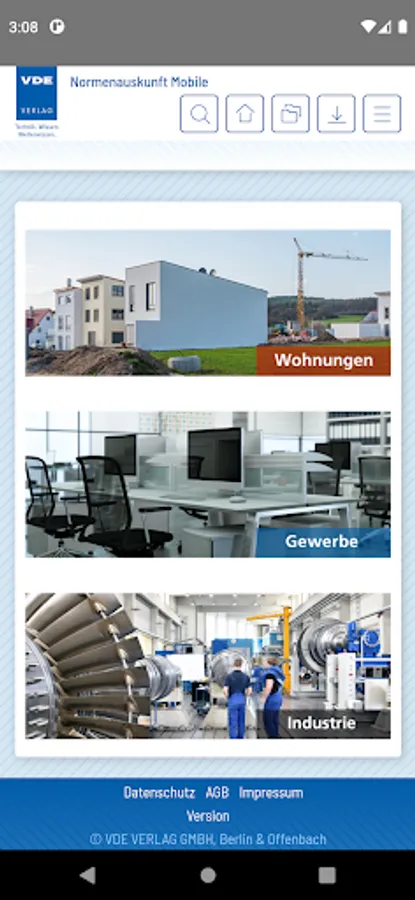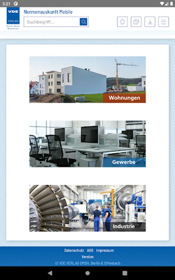 Whether at the customer's site, on the construction site, in the office or in the workshop, the mobile standards information app supports electricians in their daily work. The app attaches great importance to a clear and tried-and-tested structure as well as knowledge transfer accompanied editorially by standardization experts. Divided into the areas of housing, business and industry, the app branches off to typical subject areas in a user-friendly manner, in which the practical user will immediately find himself.