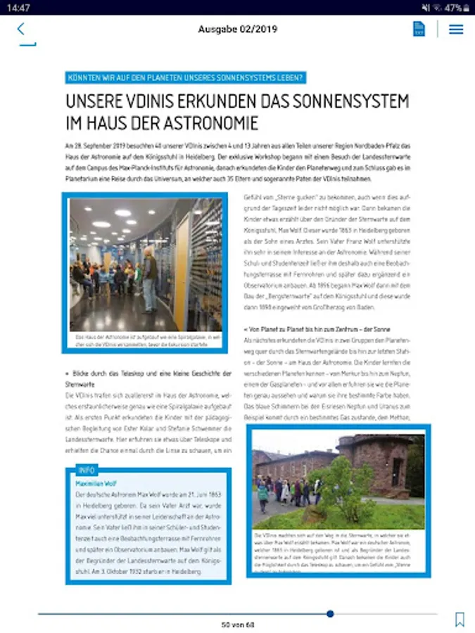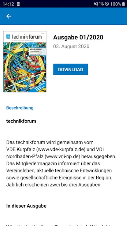 The technical forum is jointly issued by the Association of Electrical Engineering, Electronics, Information Technology (VDE) - District Association Kurpfalz and the Nordbadisch-Pfälzischen Bezirksverein des VDI. It appears several times a year and informs about technology and society in the region.