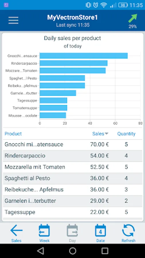 The myVectron-App displays your bestsellers as well as your slow sellers at a glance. Not only does it show the single titles but also the ratio of your top 5, top 10 and other products to the total sales, as percentage and as amount .