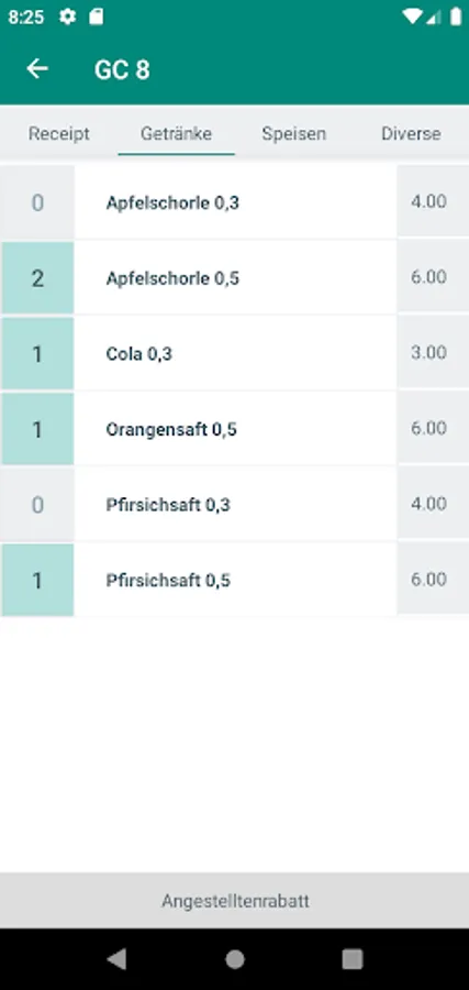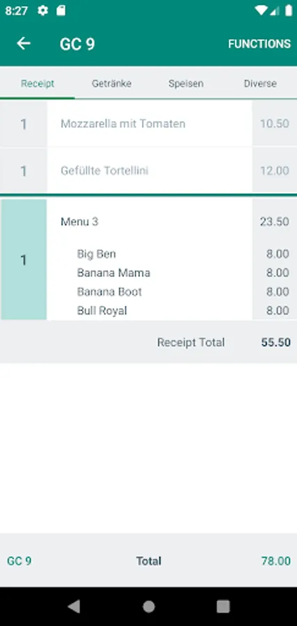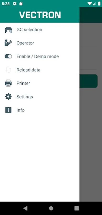 The demo mode, which you can use without connection to a stationary Vectron system for training purposes, already contains an example layout of a menu. For use in hospitality you require the network connection to a stationary Vectron system.