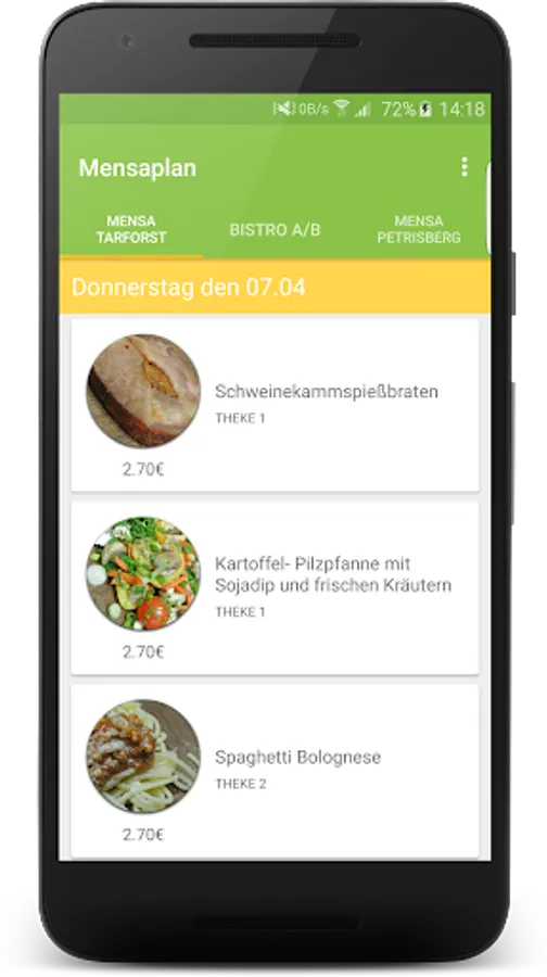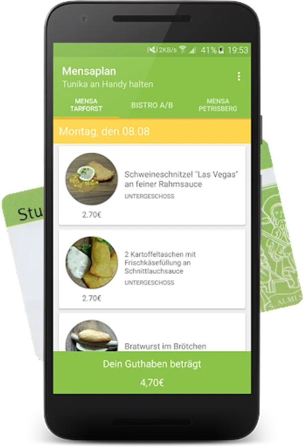 With this app you can look at any cafeteria of the University of Trier quickly and simply the daily offer. Here you get all the relevant information such as supplements, additives and prices displayed. By today's reviews, you see how many people tasted the respective food.