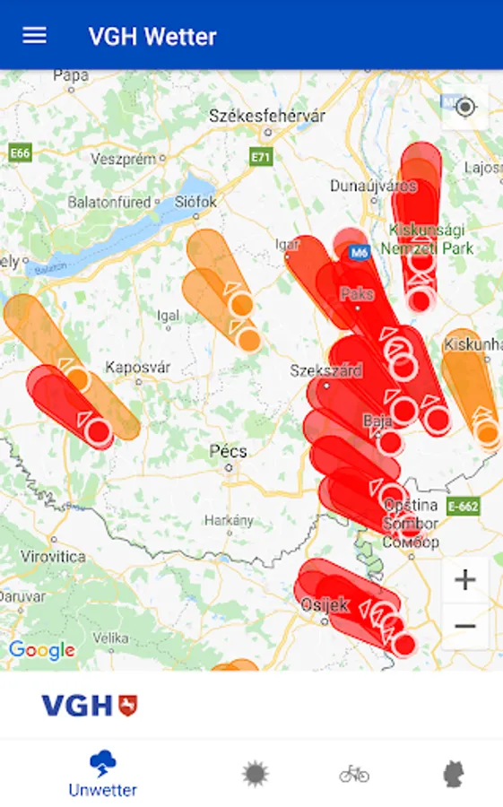 The severe weather warnings and weather information come from the severe weather center of the UBIMET group. Warnings are issued by the meteorologists of the severe weather center in the event of acute storms / hurricanes, heavy rain, heavy snowfall, thunderstorms (with heavy rain, hail and squalls), black ice rain, 1st ground frost, air frost from -150 degrees and heat from 30 degrees. All severe weather warnings are accurate to the postcode, the weather information is displayed over a large area.