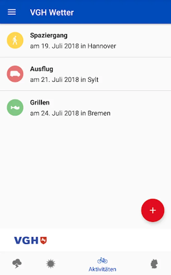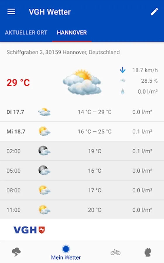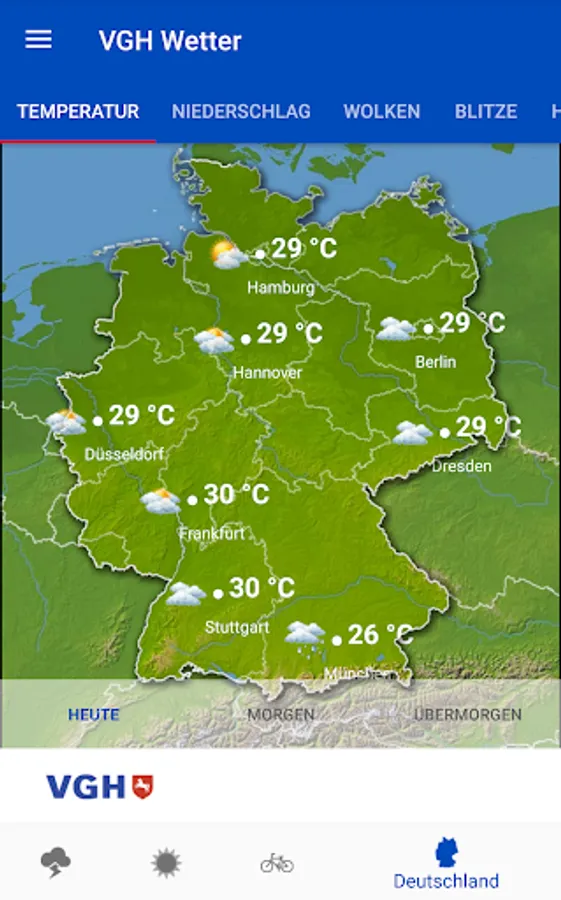 The "VGH Weather App" is a helpful service app for transmitting weather information within Germany and Europe. The app offers location-based weather forecasts including severe weather reports, overview information on German and European weather as well as weather-related notifications for leisure activities.