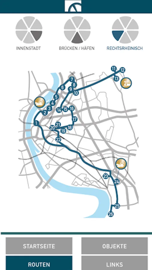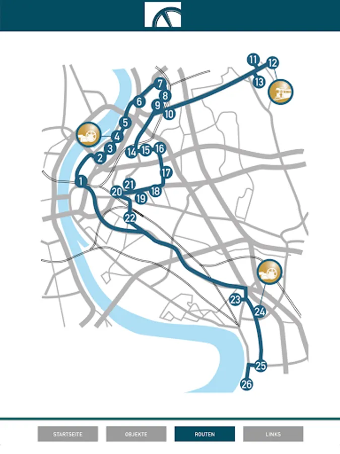 The Via Industrialis is a guide to the exciting places of industrial and traffic history in Cologne. The spectrum ranges from important evidence from the early industrial era, such as the baroque buildings from the silk weaving on the Mülheimer Freiheit, up to high-profile large-scale industrial plants from the era of high industrialization, such as the gas engine factory Deutz - the world's first engine factory, in Nicolaus August Otto the four-stroke engine invented. In addition, the route leads to important port and traffic structures that were developed or developed in close connection with industrialization: ports, railway stations, railway depots and bridges.