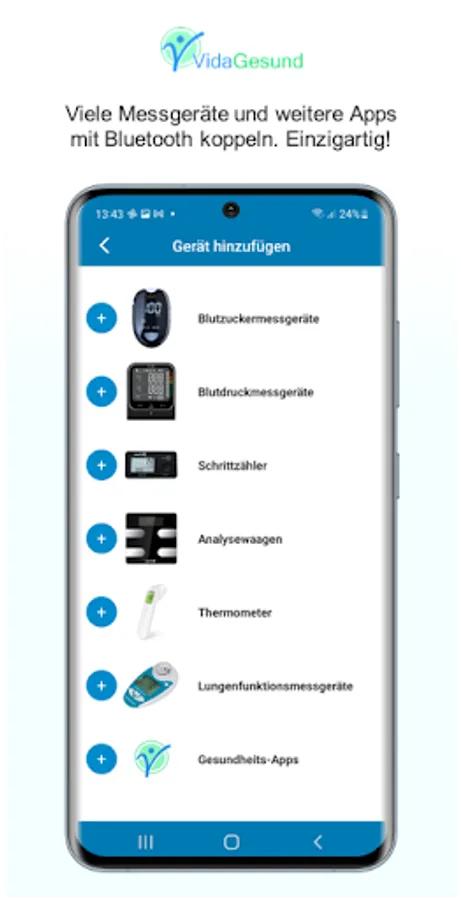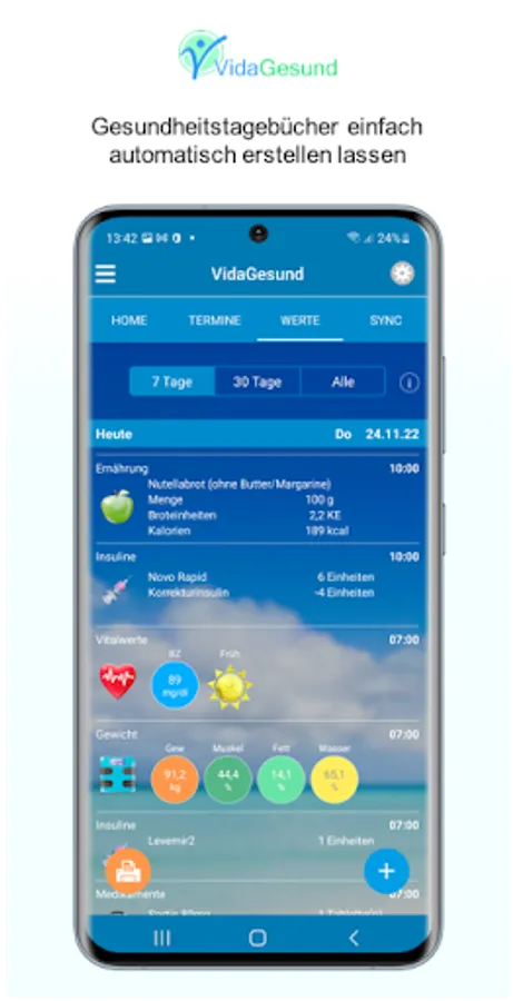 The most complete German diary app for diabetes, high blood pressure, asthma/COPD with Bluetooth and app connections. Supports you perfectly in the documentation of blood sugar, blood pressure, lung functions, weight, calories, fitness, steps, sleep, medication, etc. Everything about health in one app!