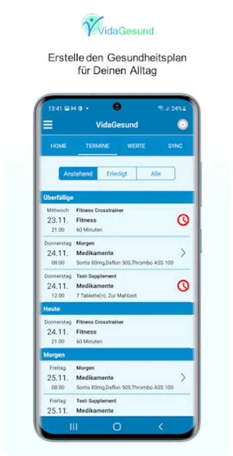 The basic version as a diary with a scheduler is free and can be used indefinitely. You can use helpful additional functions, such as long-term storage, nutritional database, management of all health documents and ID cards, as well as programs and guides with Premium or the Freemium model, which is also free of charge.