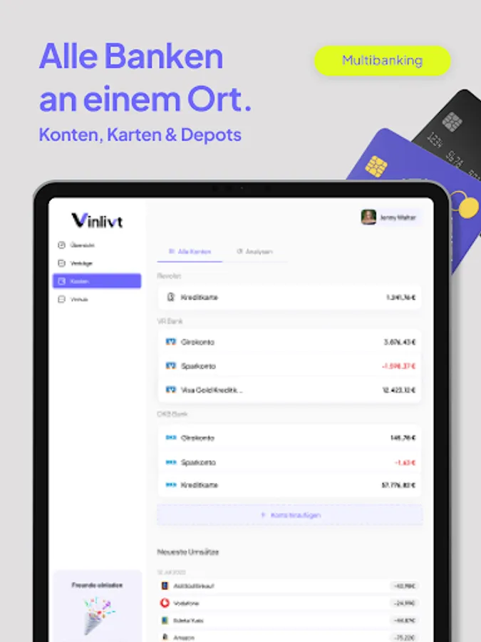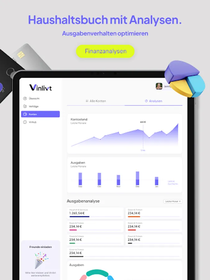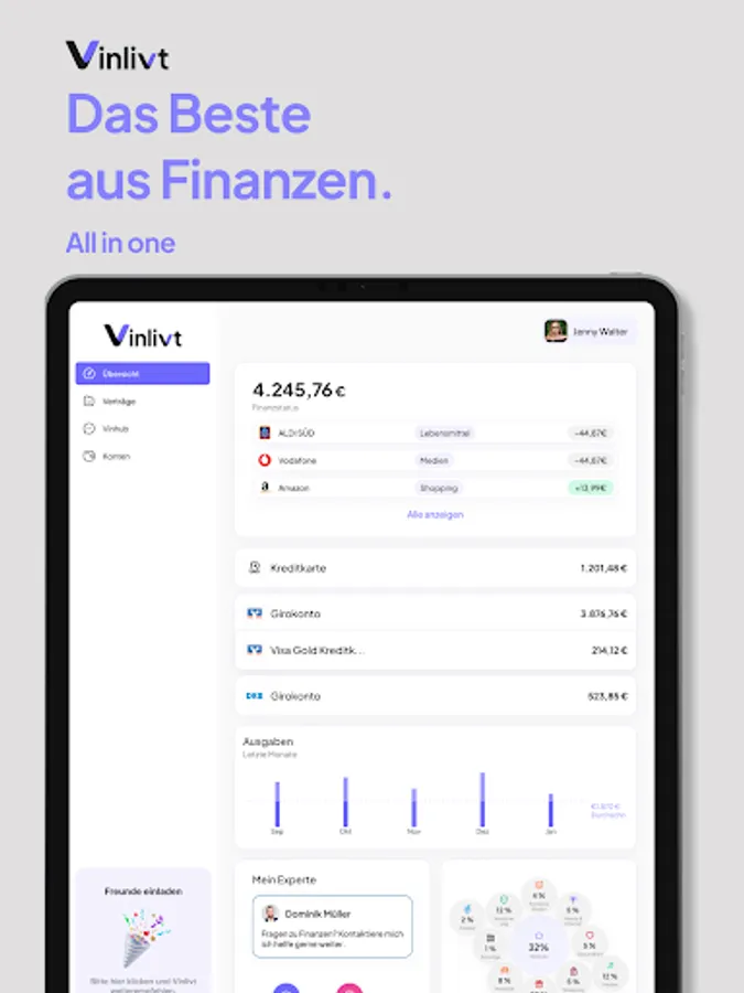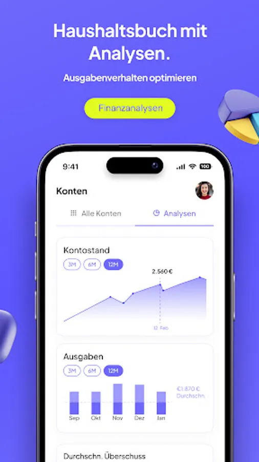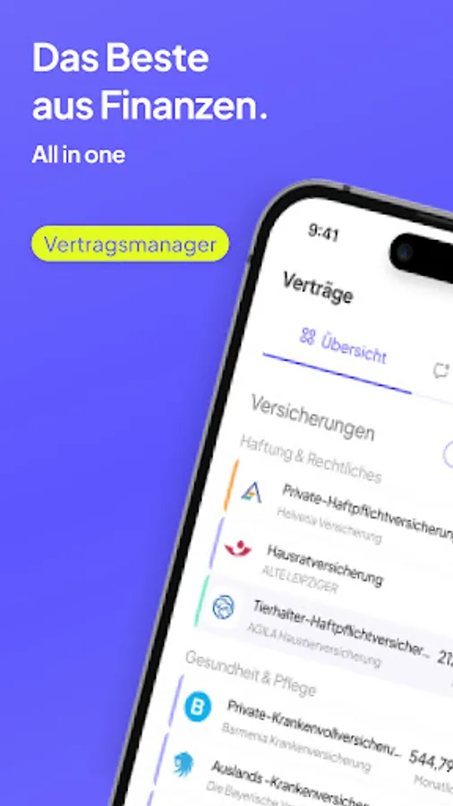 Do you have multiple bank accounts, credit cards or savings accounts? With our app you never lose track and you can securely and easily link all your bank accounts to the app. A digital household book and smart analyzes accompany you through your everyday financial life. Save cash easier than ever before. Manage your finances with ease and close important pension gaps. We help you to discover your financial potential.