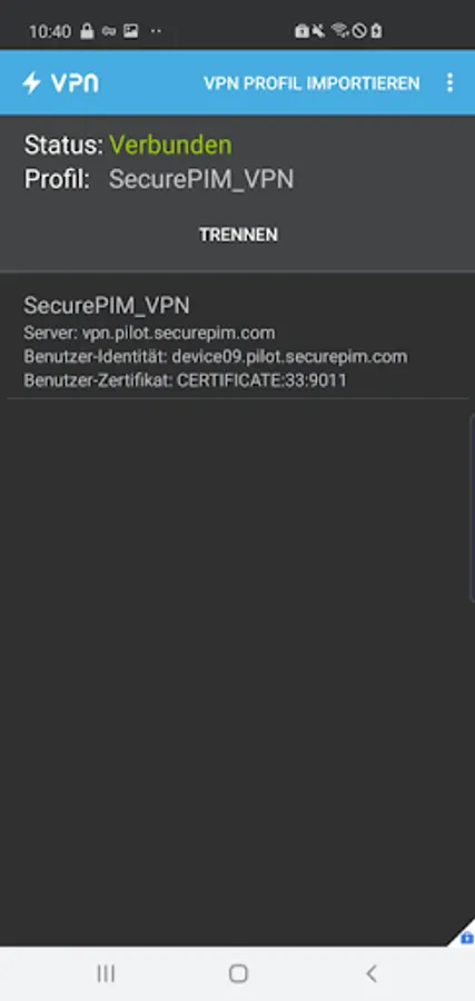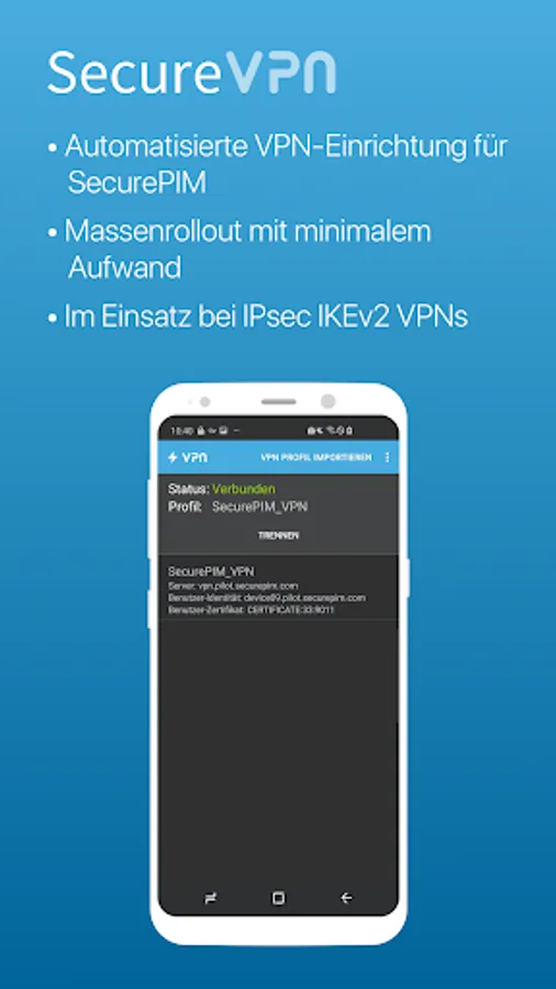 SecureVPN is a companion app for SecurePIM that enables a VPN connection to be established via an interface without user interaction. In the event of a mass rollout of Android devices, SecureVPN makes it easier to set up an IPsec IKEv2 VPN. The installation is thereby largely automated.