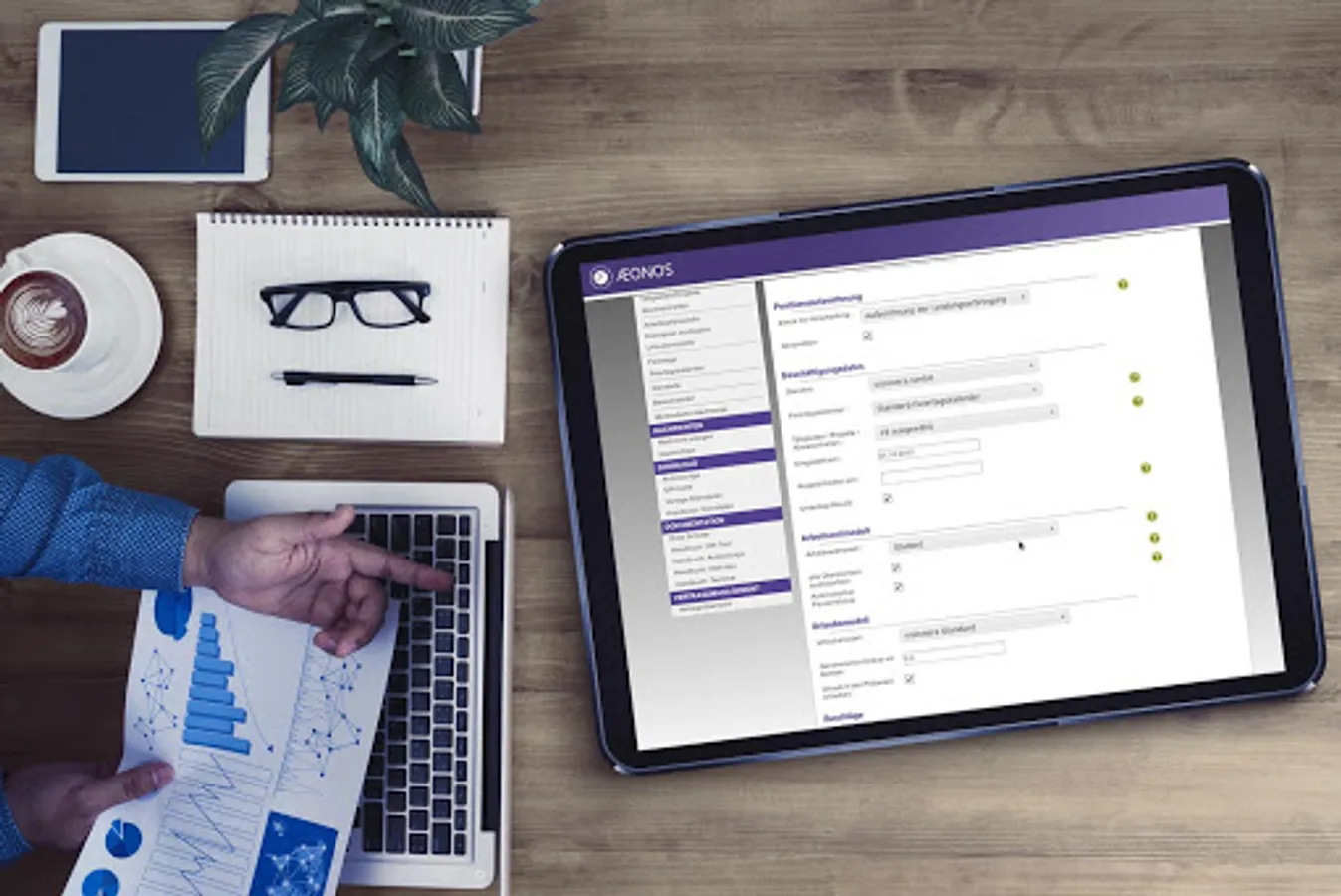 AEONOS is a time recording as a SaaS solution and, in addition to various apps and stationary time recording terminals, consists of software for managing booked working times and absences, employees, working time models, time accounts, vacation accounts, surcharges and much more.