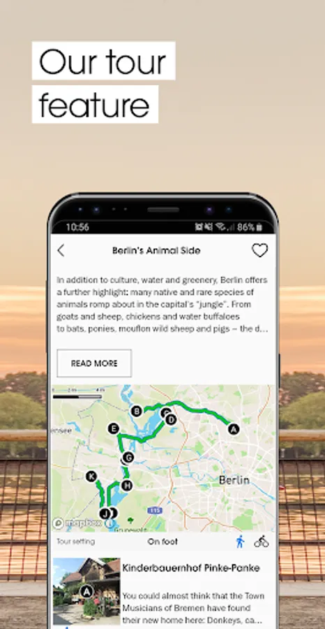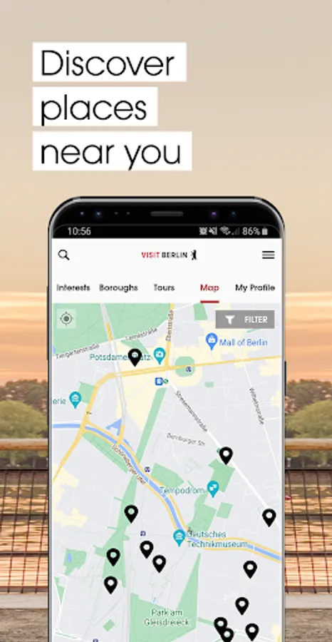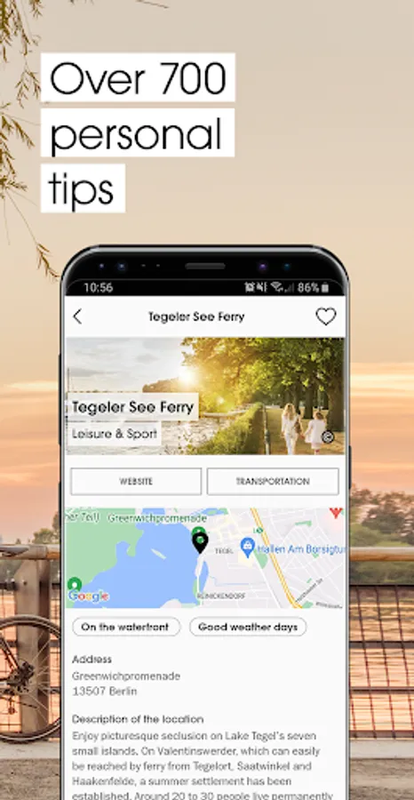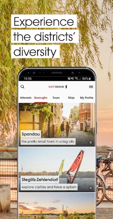 – BERLIN TIPS + INFO on the city’s districts and neighbourhoods. We also let you into the secret of our top personal Berlin tips. Discover our tips for such areas as leisure and sport or art and culture. And of course, we also offer information on specific topics – from fun things to do for free to the nearest green spaces to relax. The app also lets you suggest your own Berlin tips!