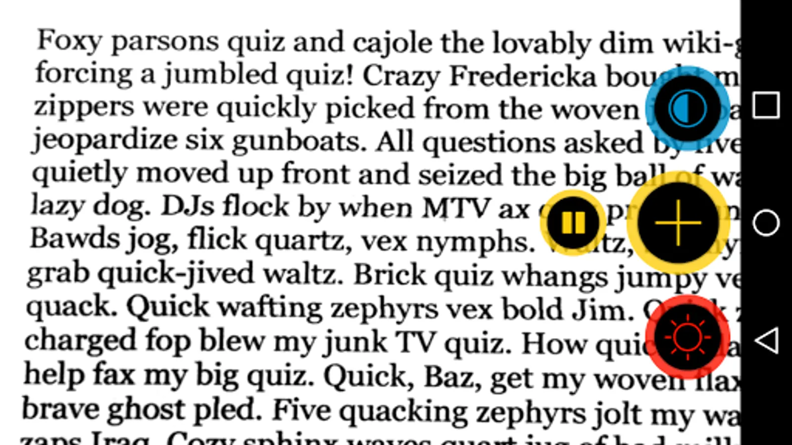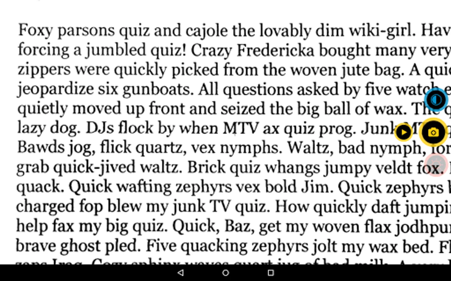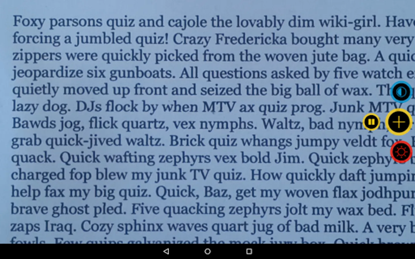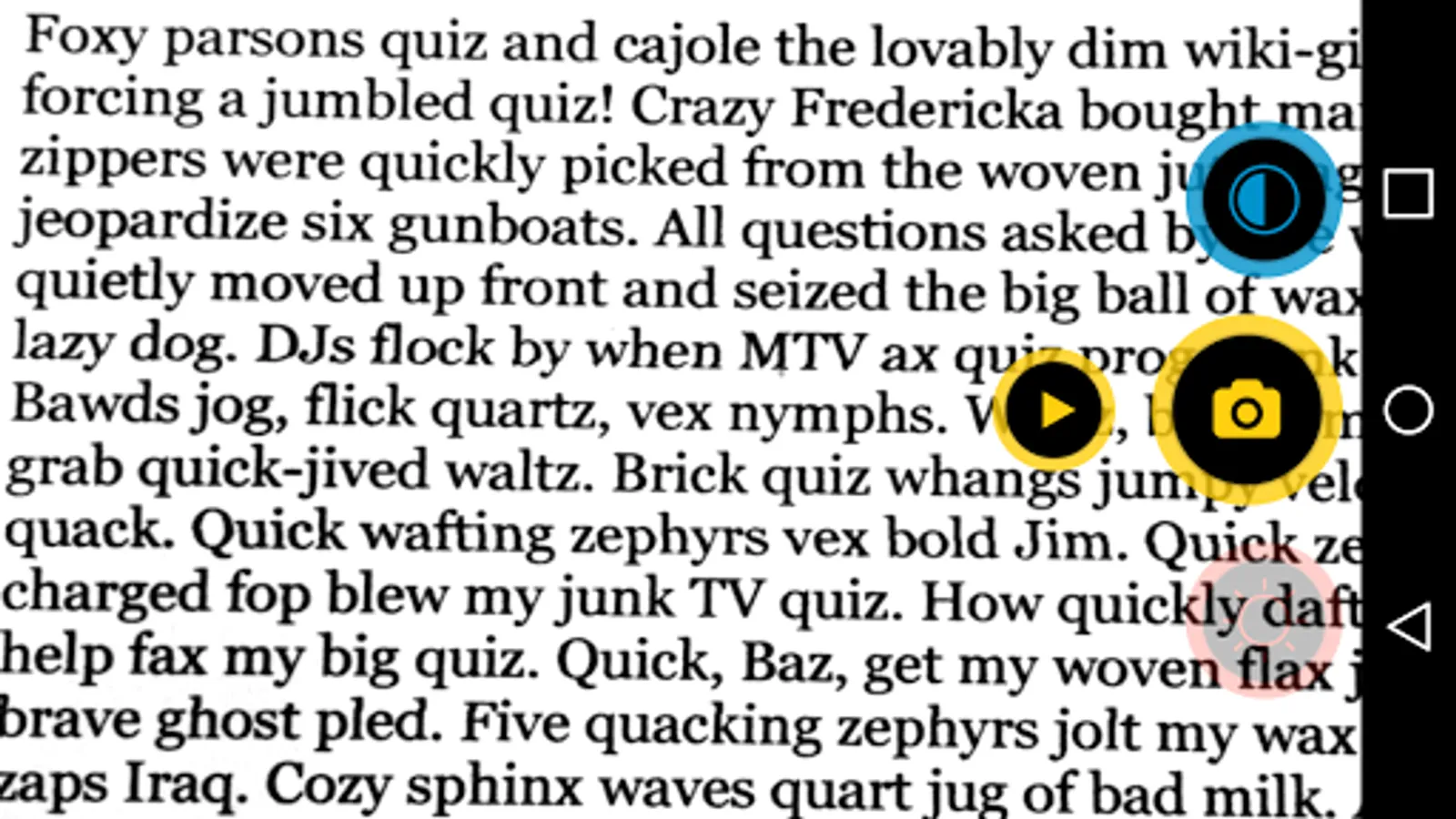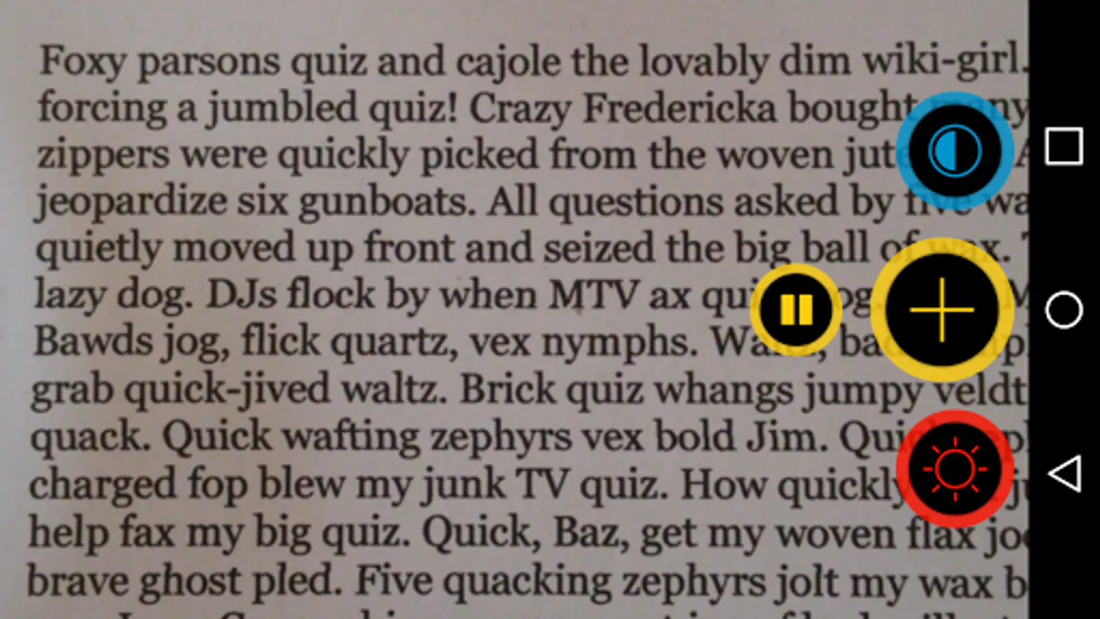 Many visually impaired people suffer from dazzling effects when reading dark characters on a light background. Visor avoids these effects by providing 5 color modes: white text on dark background, real color mode, contrast enhancement, yellow text on blue background and blue text on yellow background.