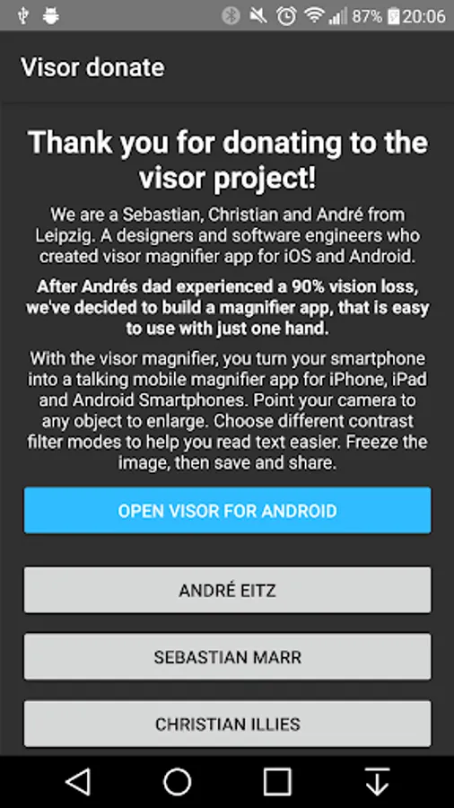 We are a Sebastian, Christian and André from Leipzig. A designers and software engineers who created visor magnifier app.