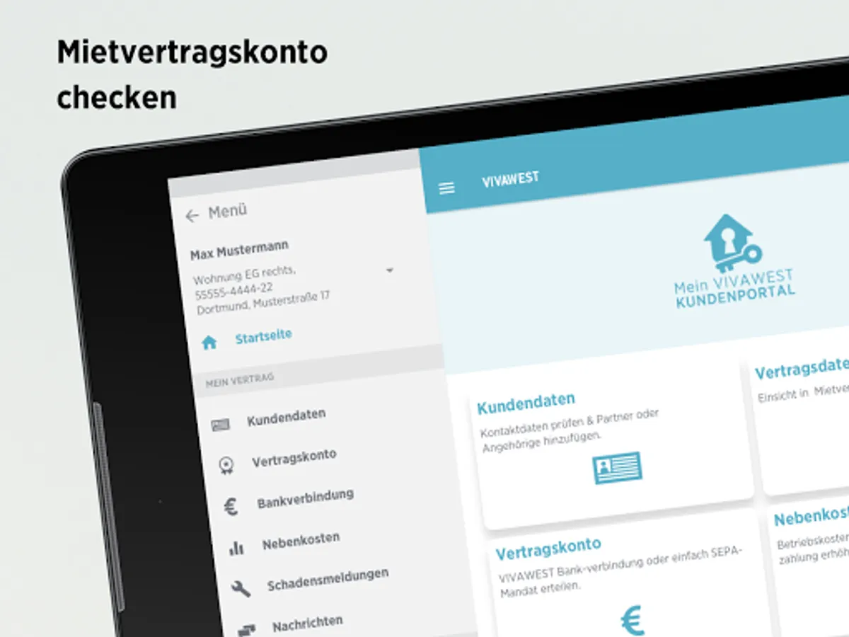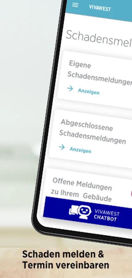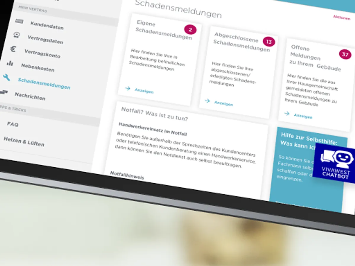 With the VIVAWEST customer portal app, as a VIVAWEST tenant, you have all information about your tenancy at hand. You can easily report damage and make an appointment for a craftsman directly, check your rental contract account, edit your personal data and send us messages! You can also chat with the VIVAWEST chatbot VIBO.