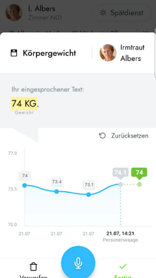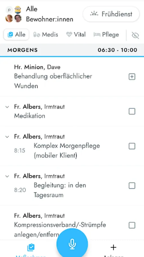 You can freely speak into the voize app and our AI can automatically create structured documentation entries from it. We transfer these entries to the existing documentation system of your nursing service or nursing home.