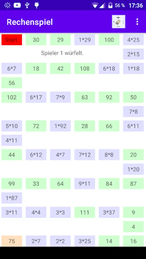 The arithmetic game is a dice game for 1 to 4 people with 27 tasks. The basic arithmetic operations can be selected individually or in combination and the number range can be set separately for each arithmetic operation