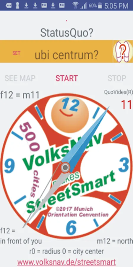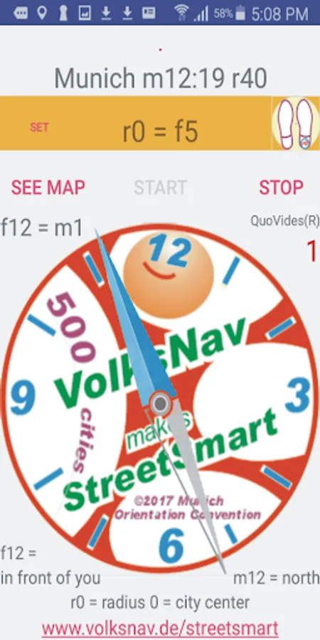The app uses GPS and compass and - a worldwide innovation - indicates the direction to the centre of town not only with a graphic but also with text which also the blind can understand !!