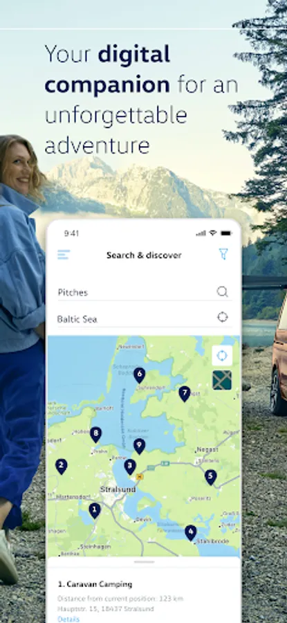 Finding the right campsite, pitch or service station along your route is easy with the integrated search function.