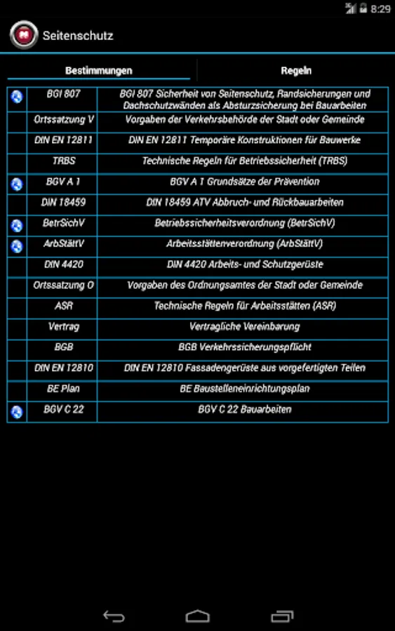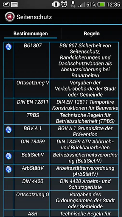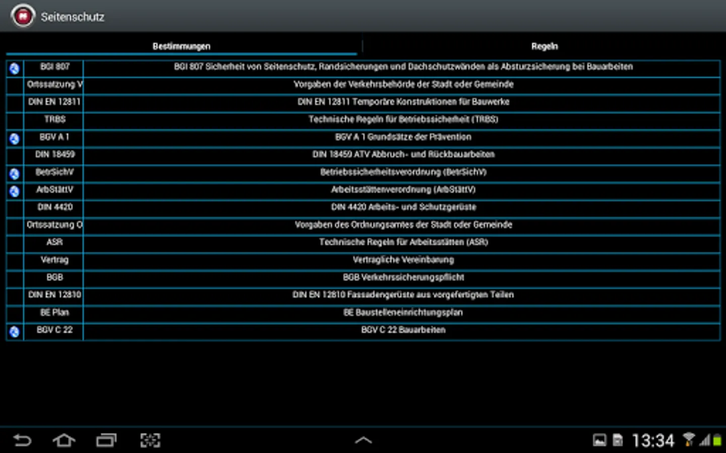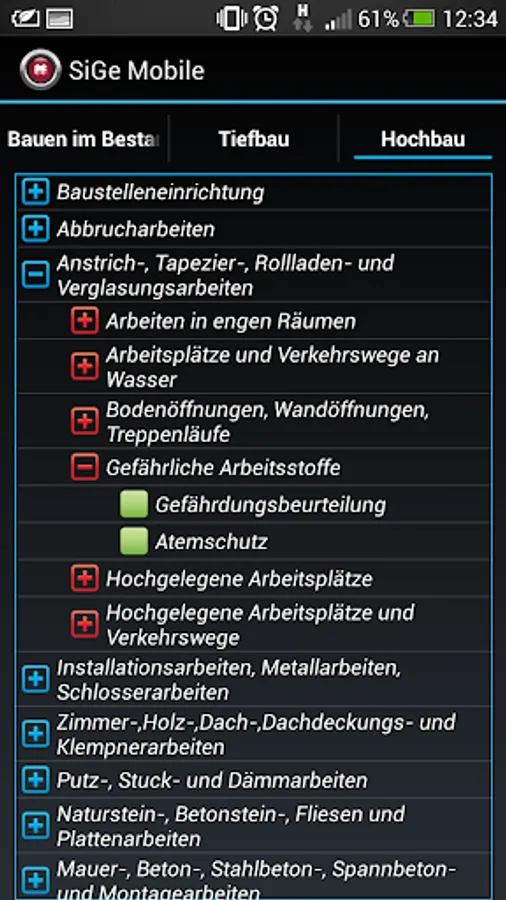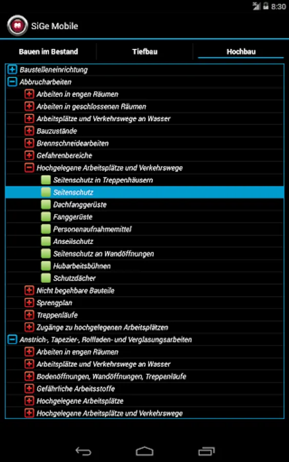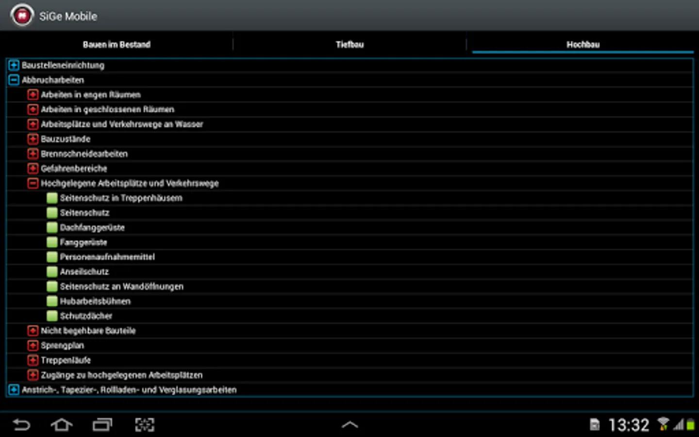 The application contains a comprehensive catalog of dangers and hazards on construction sites. This serves as a basis for the creation of health and safety plans in accordance Baustellenverordnung and is divided according to trades, hazards and their structural and bauorganisatorischen solutions. For each structural solution, the relevant laws, regulations and standards are listed, which you can also retrieve online.