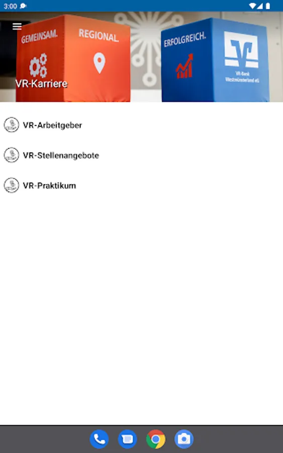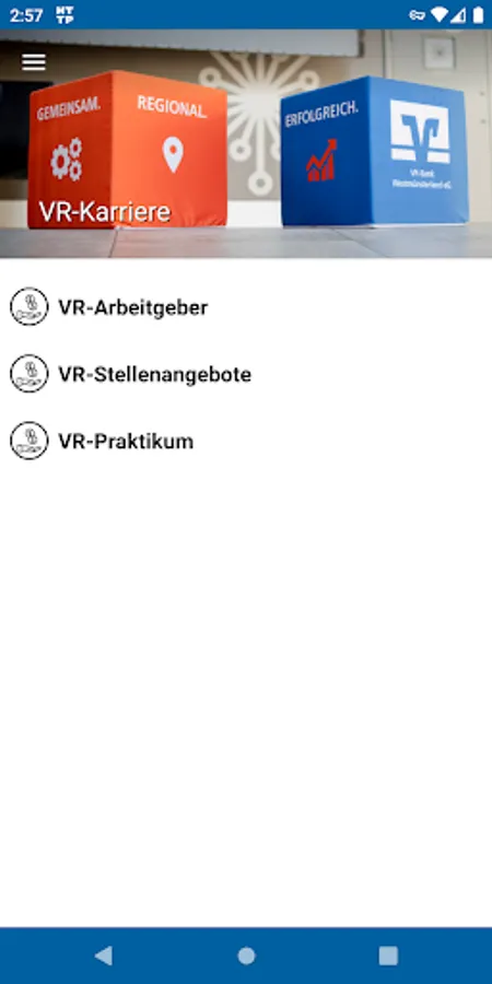 The free app offers an insight into the VR-Bank Group. The offer is supplemented by information on the VR-Bank e-charging network, job advertisements and direct access to the application option as well as an overview of all branches. A blog within the app offers participation in the VR Bank's sustainability journey. In addition, an opportunity for contact is created in a protected atmosphere.