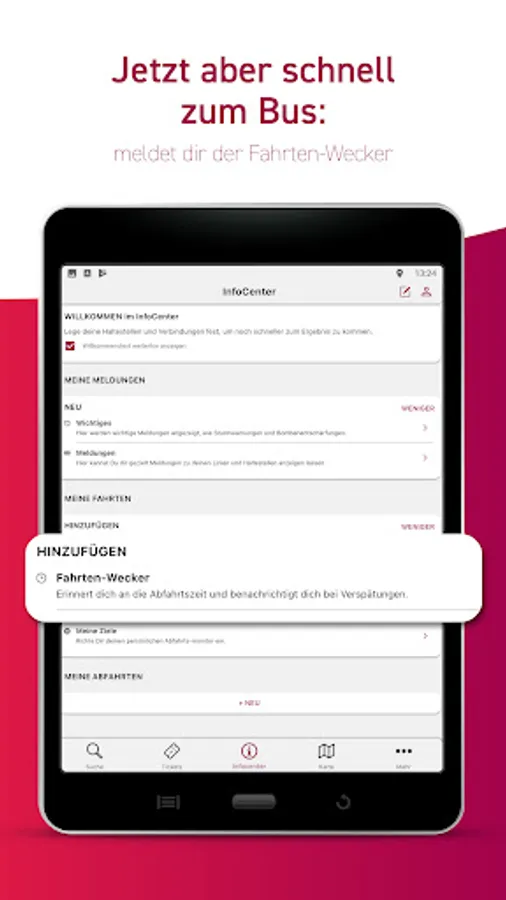• Personal area: For regular trips by bus and train, you can save your most important destinations in your personal area and in future you will receive important information at a glance.
