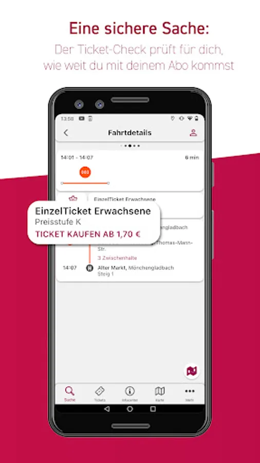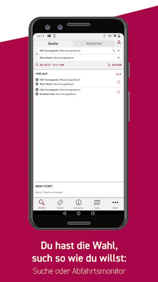 From Europaplatz to Borussia Park? Or from Marienplatz to the Abteiberg Museum? With the NEW MöBus app you can find your ideal connection from A to B in the NEW local transport network and throughout the VRR. Is there a delay on your route? The practical helper will also inform you about this.