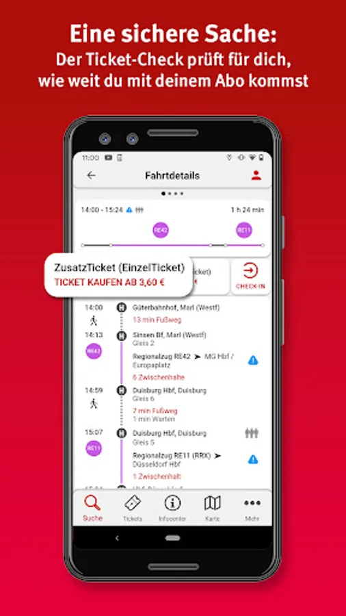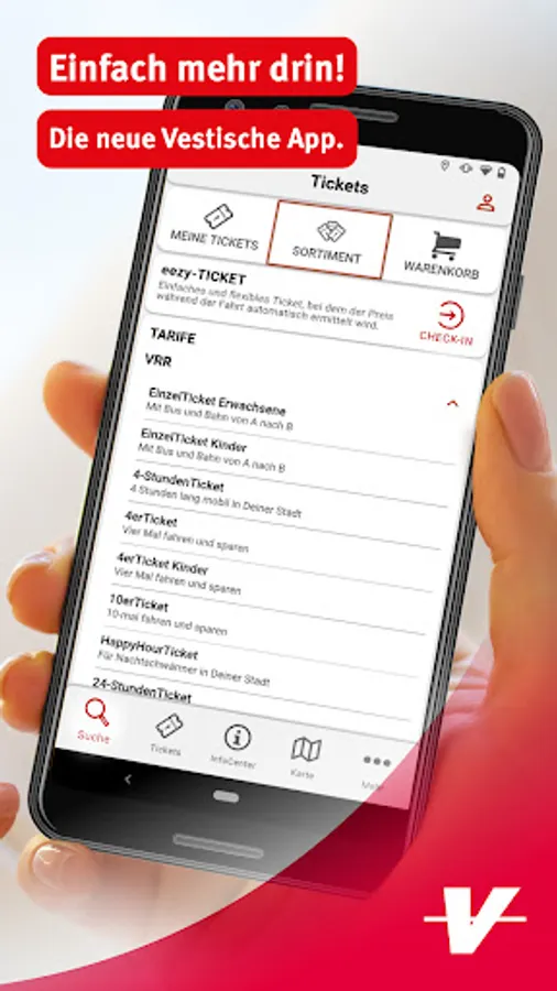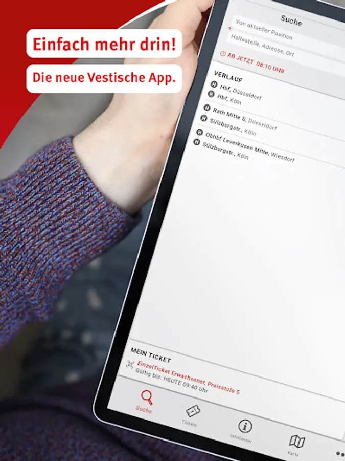 The Vestische App applies to the timetable of buses and trains in the Recklinghausen district, the cities of Bottrop and Gelsenkirchen, and for the entire Verkehrsverbund-Rhein-Ruhr (VRR). Of course, the app also shows you connections to neighboring transport associations.
