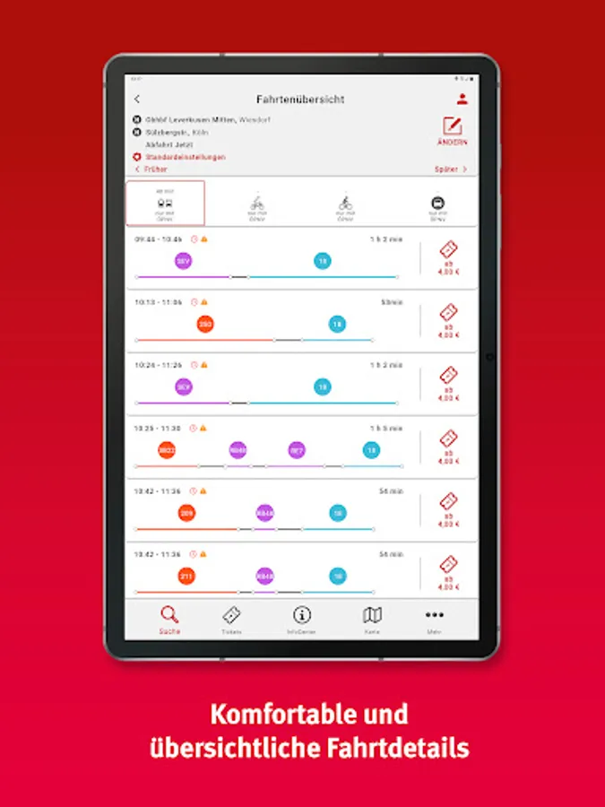 • Bicycle routing: by bike to the stop or from the stop to the destination? The app shows you how the bike can best be combined with bus or train.