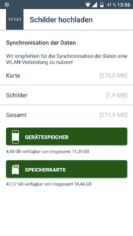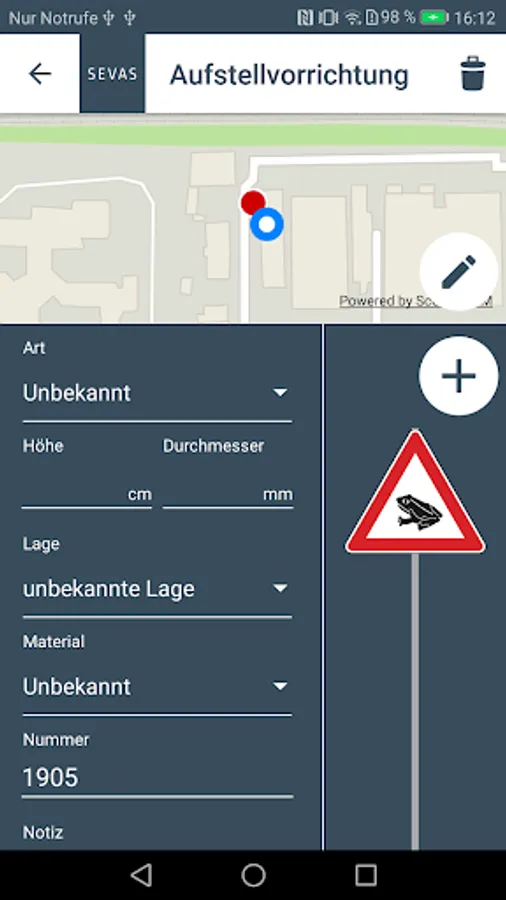 If you have a login for the SEVAS system, you can use this app to load the installation devices and traffic signs stored there into the app, update data offline on site and save photos and then update the data in the SEVAS system.