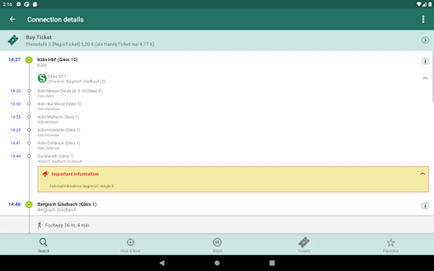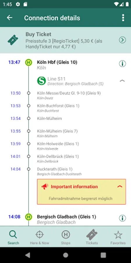 Lots of detailed information on every stop in the VRS area. Departure monitor, locations of P+R and B+R, current availability of escalators and elevators or the available rental bikes are just four of many types of available information.