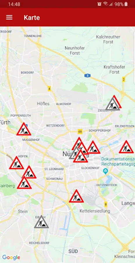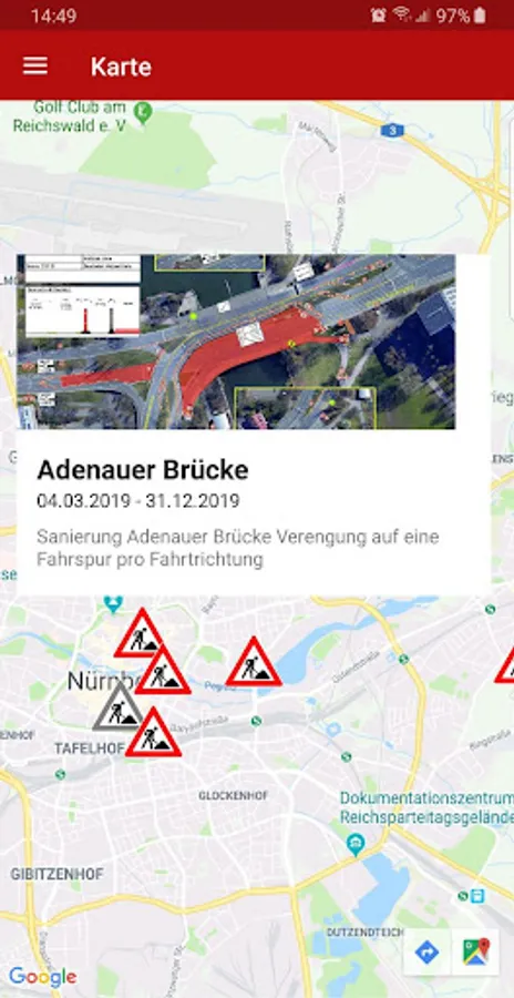 Look at the map for important construction sites, what they look like on site, and when they are over. Also, planned construction sites are displayed so you know well in advance.