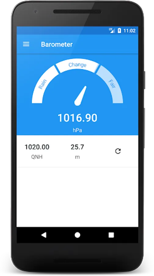 This barometer shows the actual air pressure (e.g. in hPa / mBar or inHg) measured by your device and calculate the altitude (m or ft) by configuring the QNH value of the next airport.