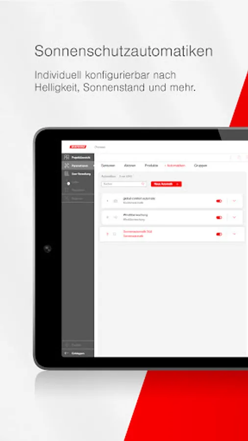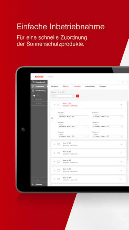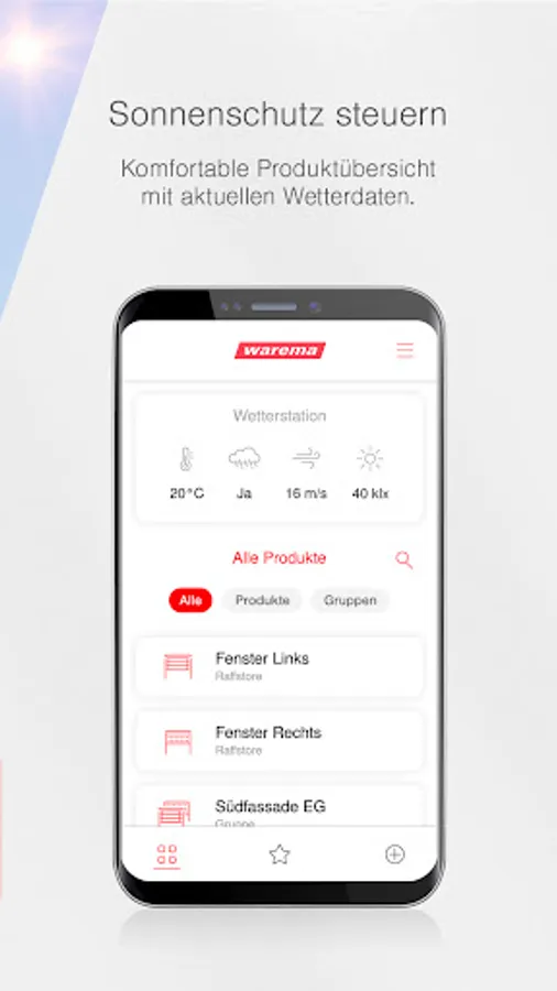 Operate your products more easily than ever before on your PC, smartphone or tablet - whichever suits you best. The app even works without an internet connection. It couldn't be easier to select sun shading products and raise or lower them in the app. Current weather data and causes of movement are also displayed. The optional cloud connection means your sun shading products can also be externally operated. It couldn't be more convenient!
