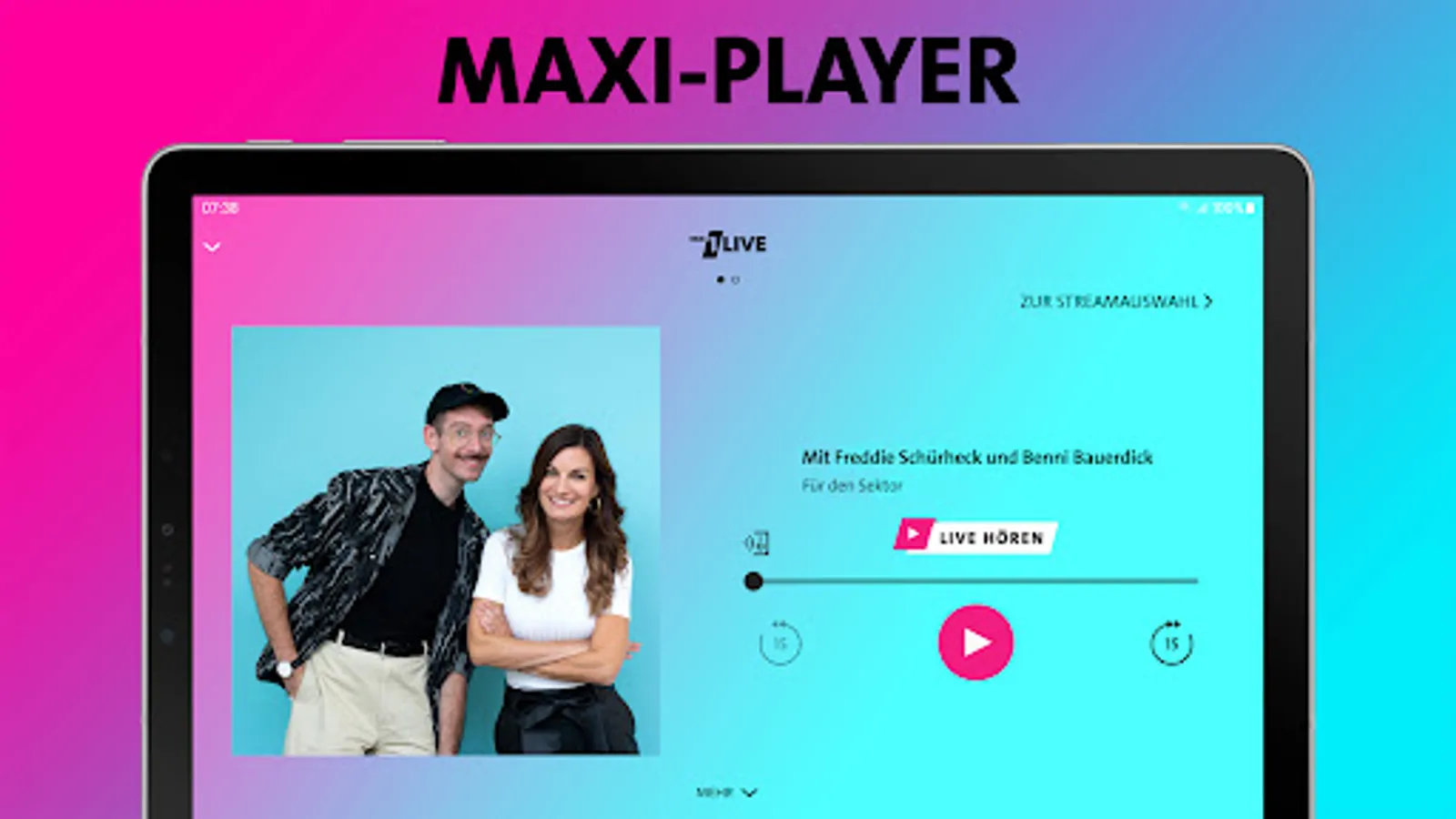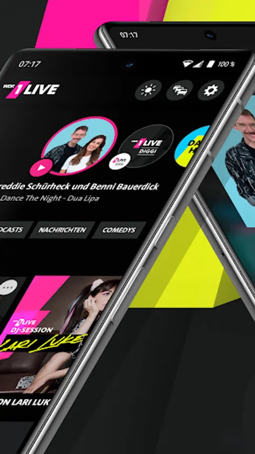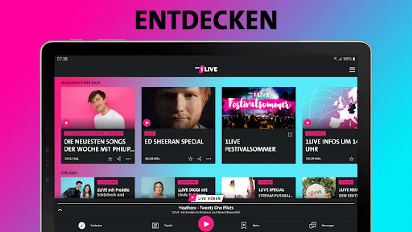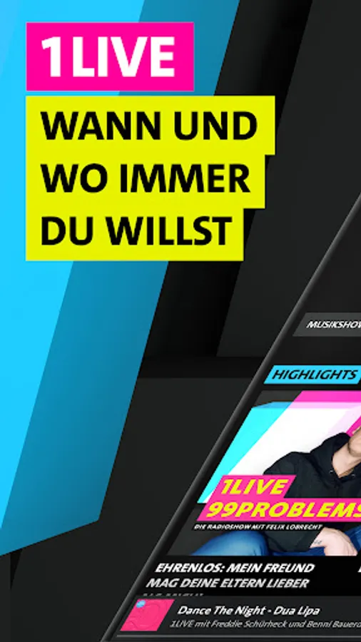 We bring 1LIVE directly to your smartphone or tablet. Presented by your favorite hosts, you get the best music, the funniest comedies, the latest news, the most popular podcasts, radio and music shows 24/7. Stream your sector program now live or on demand whenever you want!