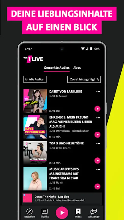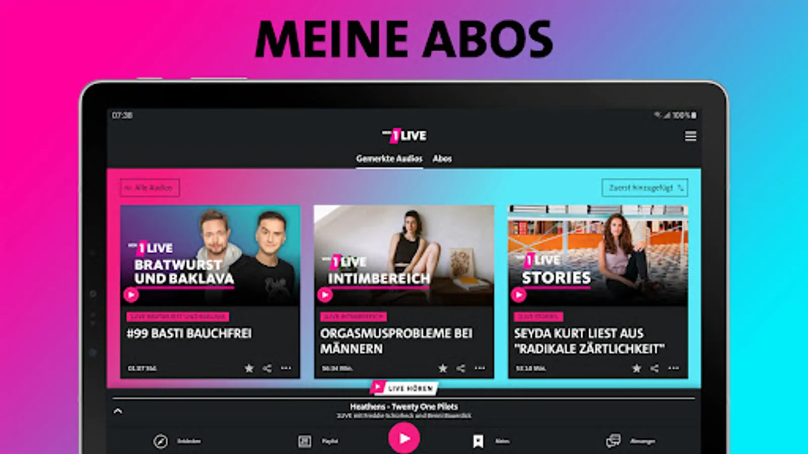 Subscribe to your favourite shows now and never again miss the “O-Ton-Charts”, an episode of our comedy highlights "Dennis ruft an" or the latest edition of the "1LIVE DJ Session". Our podcasts are also available on demand at any time. Enjoy your individual 1LIVE programme in the "MEINS" section whenever you want - even offline and without an internet connection.