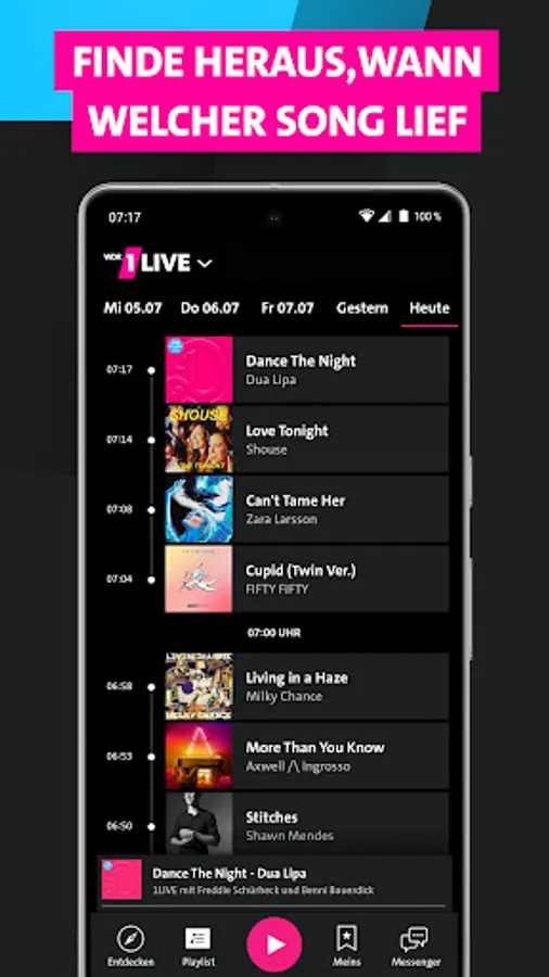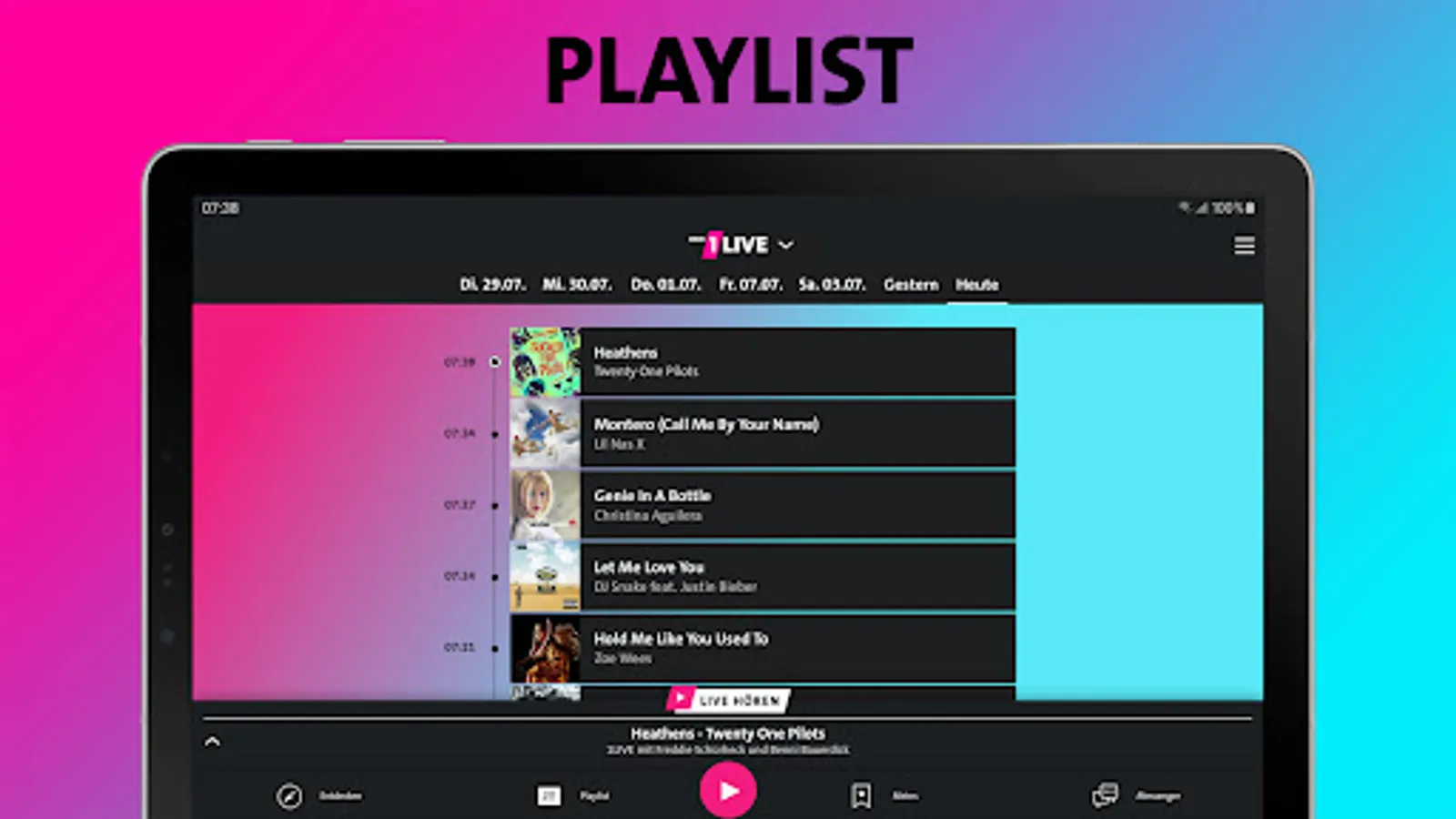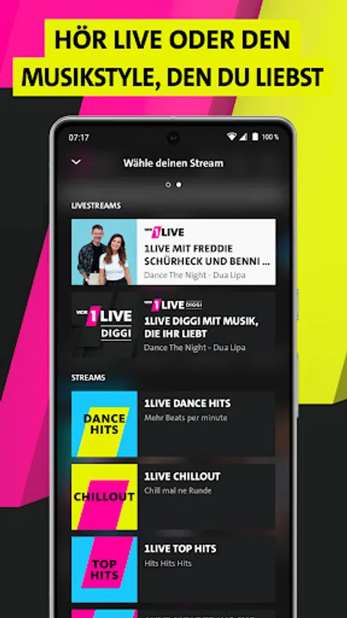 Stream your favorite radio stations 1LIVE and 1LIVE DIGGI live. With our playlist including cover display you will always have an overview of the most recently played songs. For even more music simply listen to our other streams. The app gives you direct access to "Dance Hits", "Top Hits", "Hip Hop & R'n'B", "Rock Hits", a "Chillout" stream and the "Mix of the Week", a specially curated selection of music on regularly changing themes.